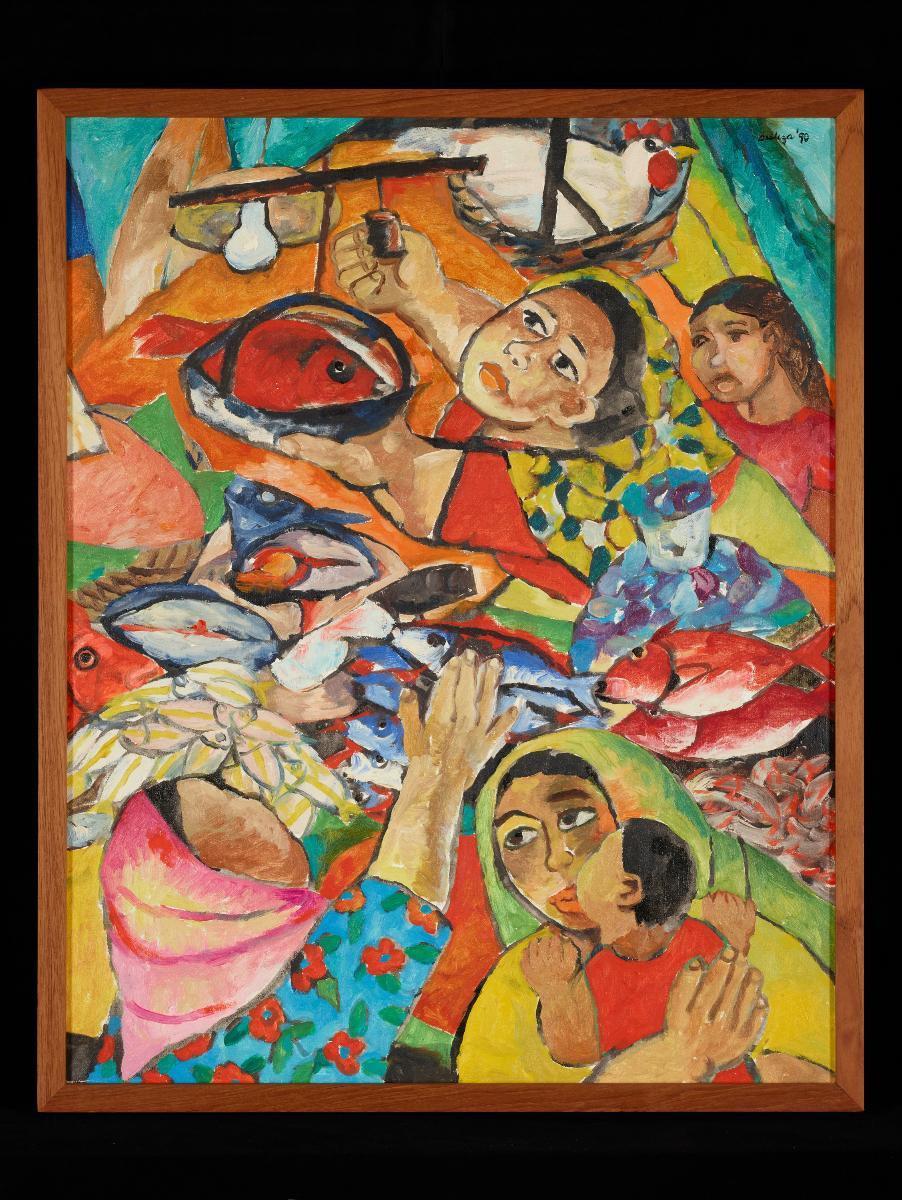 This photograph is part of a set acquired from the National Geographic Society, a non-profit scientific and educational institution. The photographs depict the sights and scenes of Singapore, Malaysia, Thailand, and Indonesia. This particular photograph shows fish vendors in a village market in Celebes, Indonesia.