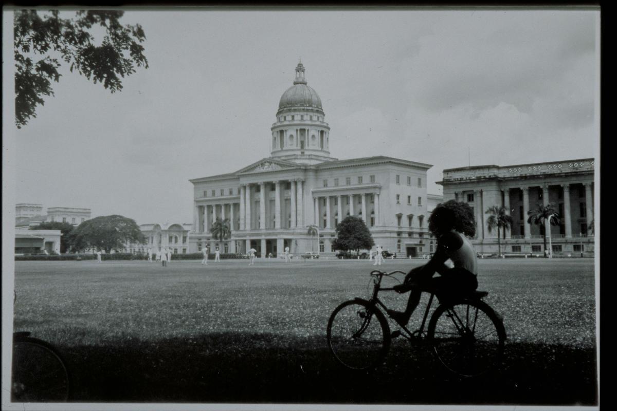 This photograph is part of a set acquired from the National Geographic Society, a non-profit scientific and educational institution. The photographs depict the sights and scenes of Singapore, Malaysia, Thailand, and Indonesia. This particular photograph shows a group of men and their bicycles in Johor, Malaysia.