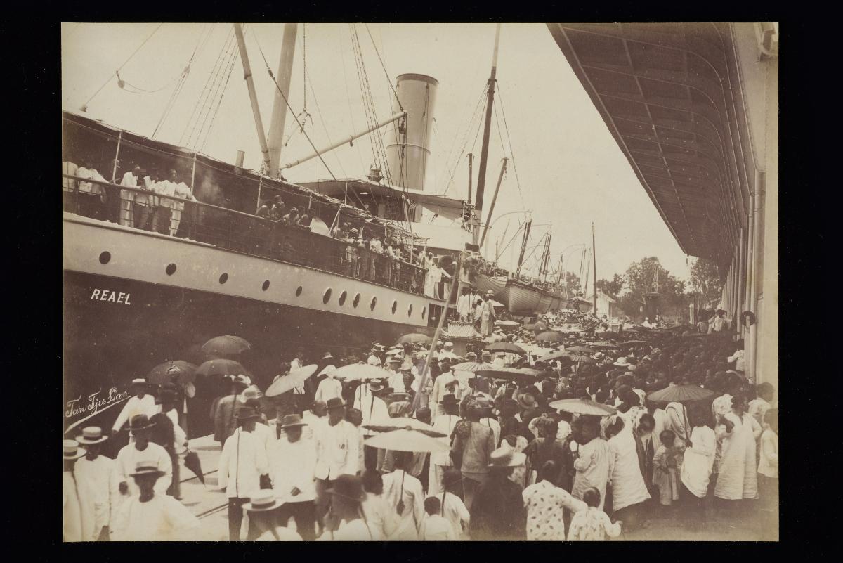 This photograph is part of a set acquired from the National Geographic Society, a non-profit scientific and educational institution. The photographs depict the sights and scenes of Singapore, Malaysia, Thailand, and Indonesia. This particular photograph shows the Tandjong Priok Harbour in Java, Indonesia.
