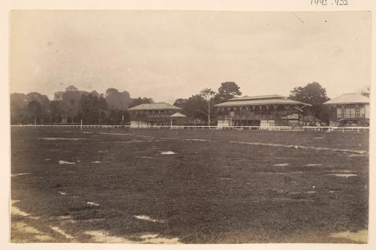 This photograph is part of a series which depicts the sights and scenes of 19th and 20th century Singapore.The origins of the first racecourse for horses in Singapore can be traced to the founding of the Singapore Sporting Club by a group of European racing enthusiasts in 1842. Located at what is today Farrer Park, the swampy land was cleared using Indian convict labour. The inaugural official racing event held at the tracks was the Singapore Cup, which premiered with much fanfare in 1843. Initially a social gathering point exclusively for the European community, the racecourse was soon frequented by elites from the Malay and Chinese communities who were keen on horse racing. Soon after the Club was renamed the Singapore Turf Club in 1924, the Club’s committee decided that the racing facilities were inadequate for coping with the growing interest in the sport. The Club eventually sold the race grounds and shifted to a new racecourse at Bukit Timah in 1933.
