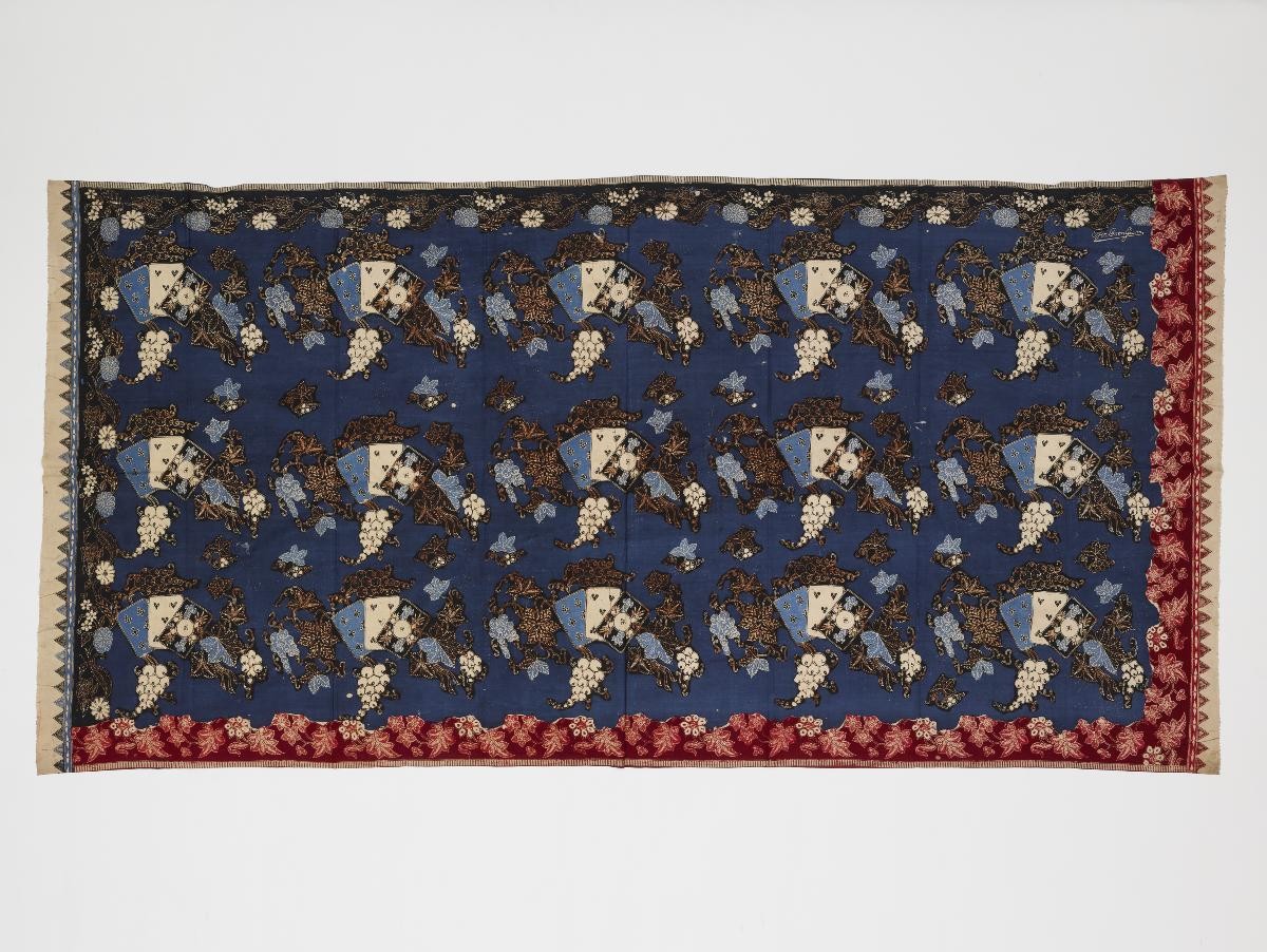 Batik sarongs were worn by nyonyas to match their baju panjangs and kebaya. Sarongs were commonly made from batik textiles, where plain woven fabric is decorated using molten wax applied or drawn onto the cloth. After successive applications of wax and dye, intricate patterns and designs can be created. This is a red and beige sarong, signed by batik atelier Kwek Hoen Tjoe with floral and butterfly motifs.It is a Demak piece but was acquired from a Cirebon family.This sarong displays the typical motifs and colour schemes popular with Peranakan Chinese communities in Indonesia and the Straits Settlements of the mid 20th century.