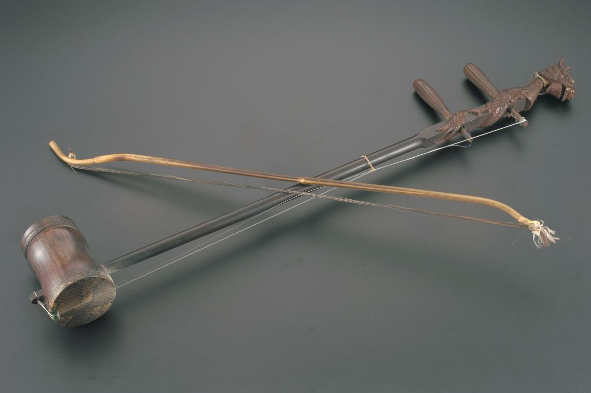 The erhu (or two-stringed fiddle) is a bowed-string instrument with its neck and body made of wood. The neck terminates in a carved dragon's head. The The erhu (or two-stringed fiddle) is a bowed-string instrument with its neck and body made of wood. The design of this erhu is enhanced by the carved dragon's head. A worn-off label on the body indicates that this erhu was made by 'Cai Fu Ji Musical Instruments', a manufacturer of Chinese musical instruments originally based in Shantou (eastern Guangdong province, China) which later expanded its business to Hong Kong.This instrument originally belonged to the Er Woo Amateur Musical and Dramatic Association, which was formed in 1912 by a group of Teochew businessmen in Singapore. The Association sought to promote Han opera and music, which originated in Hubei, China, in the 16th century. These art forms gradually spread and by the 19th century, they had gained popularity among the Hakka and Teochew communities in Guangdong province.