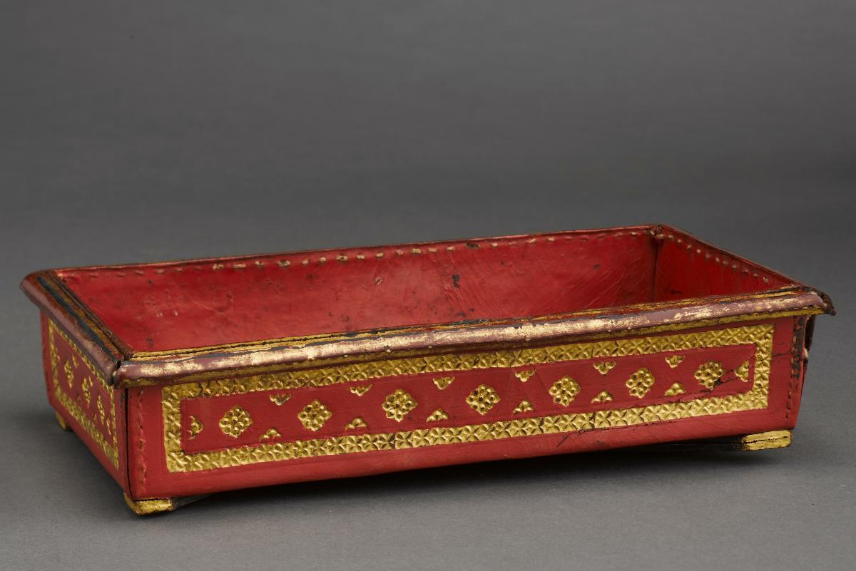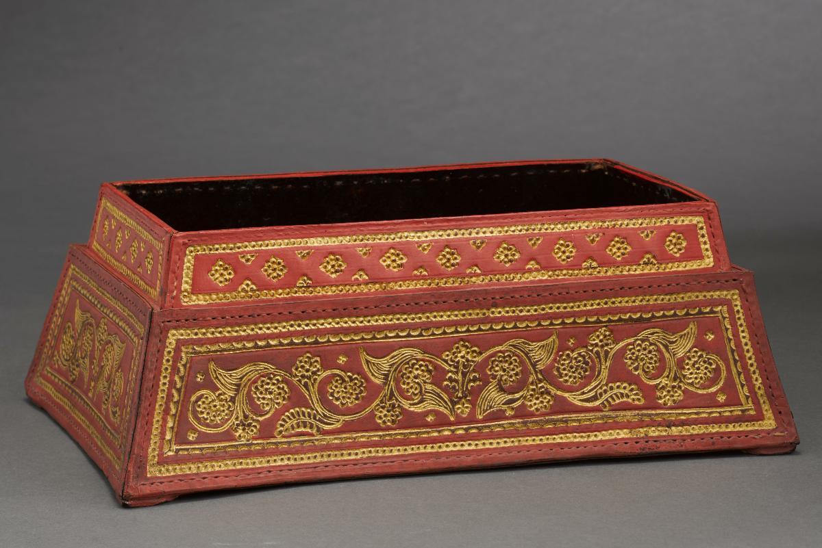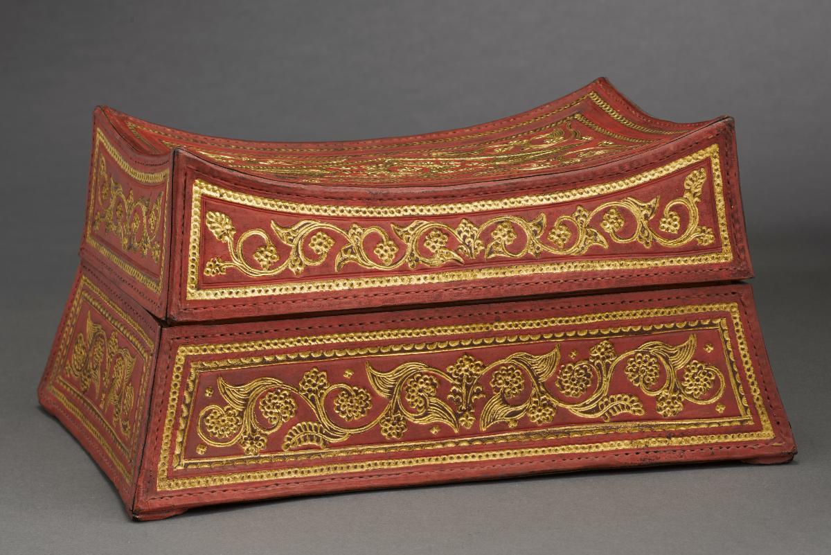 This lacquer box is decorated with yun work in pink, red, yellow, green and black colours. The narrative design is thought to depict one of the Jataka stories (stories of Buddha's past lives) known as the ‘Burijata’ - the story of the Serpent King. The base has an inscription which refers to ‘Master Kyaw’ and the place name: Pye Su Wat, in Bagan.Betel boxes are one of the most popular forms within the vast repertoire of Burmese lacquer. The tradition of betel-chewing required approriately designed boxes, in which the necessary ingredients could be stored and presented at a range of social and ritual occasions. As in many Southeast Asian cultures, betel became a signifier of social status and likewise the betel box. In Burma, royal gifts of betel were made to favoured guests, and the ritual procession of a young monk to his novitiation ceremony was usually proceeded by a beautiful young girl who carried a betel box.