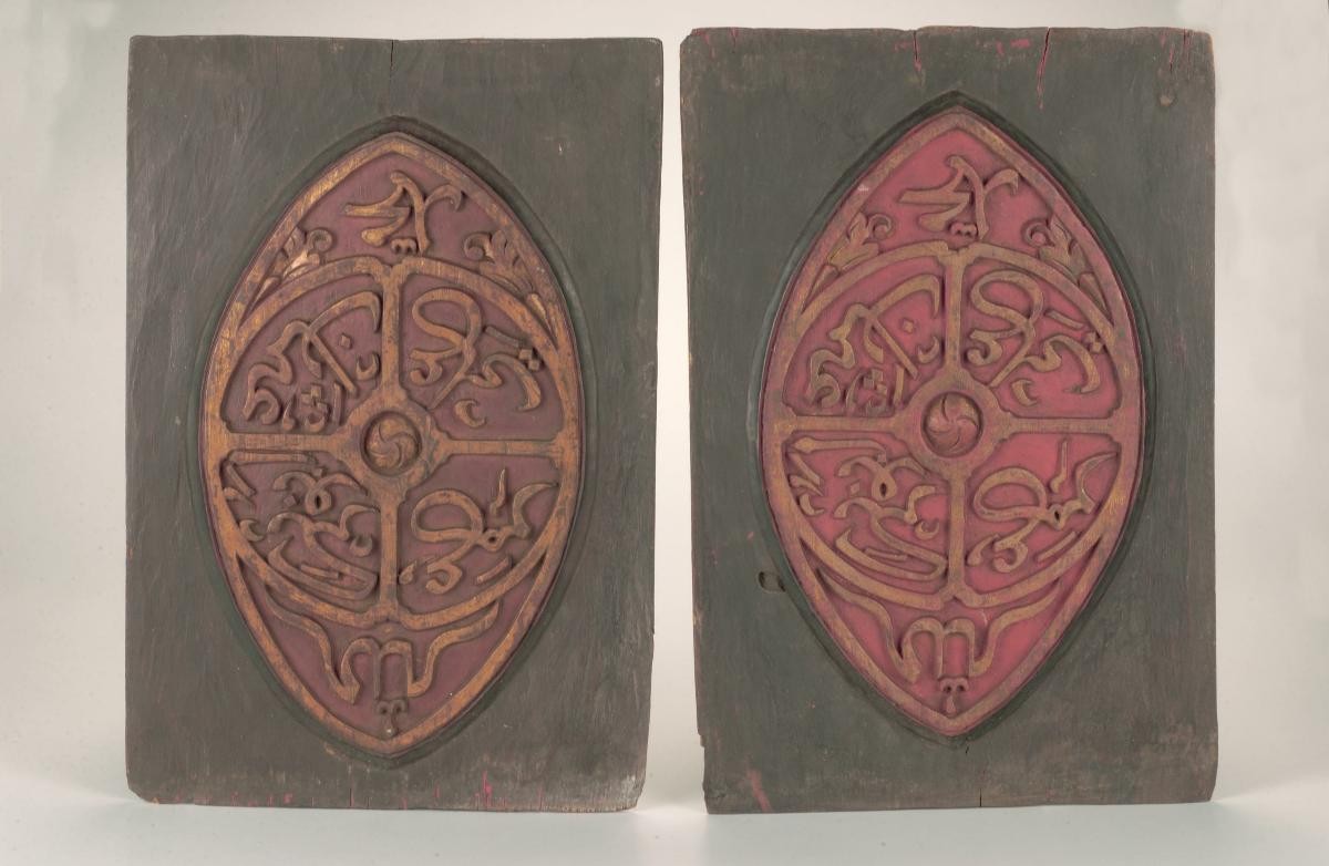This pair of carved wooden panels probably enshrined a Buddha image on an altar. The design consists of three interlaced planes of foliage organized in an undulating pattern known as tha-zin-khwei. The birds perched among the vines are either geese (hamsa, the emblem of Mon kings), or the Burmese crane (karaweik). Carved out of teak, the panels are embellished with lacquer and glass mosaic inlay (hman-zi shwe-cha), and finished with gilding. During the late Konbaung Period (1752-1885), King Mindon created an important Buddhist centre at the capital of Mandalay. These panels are relatively simple examples of the elaborate style typical of the time, although they are large in scale. They were probably made for a house shrine or a small monastery.