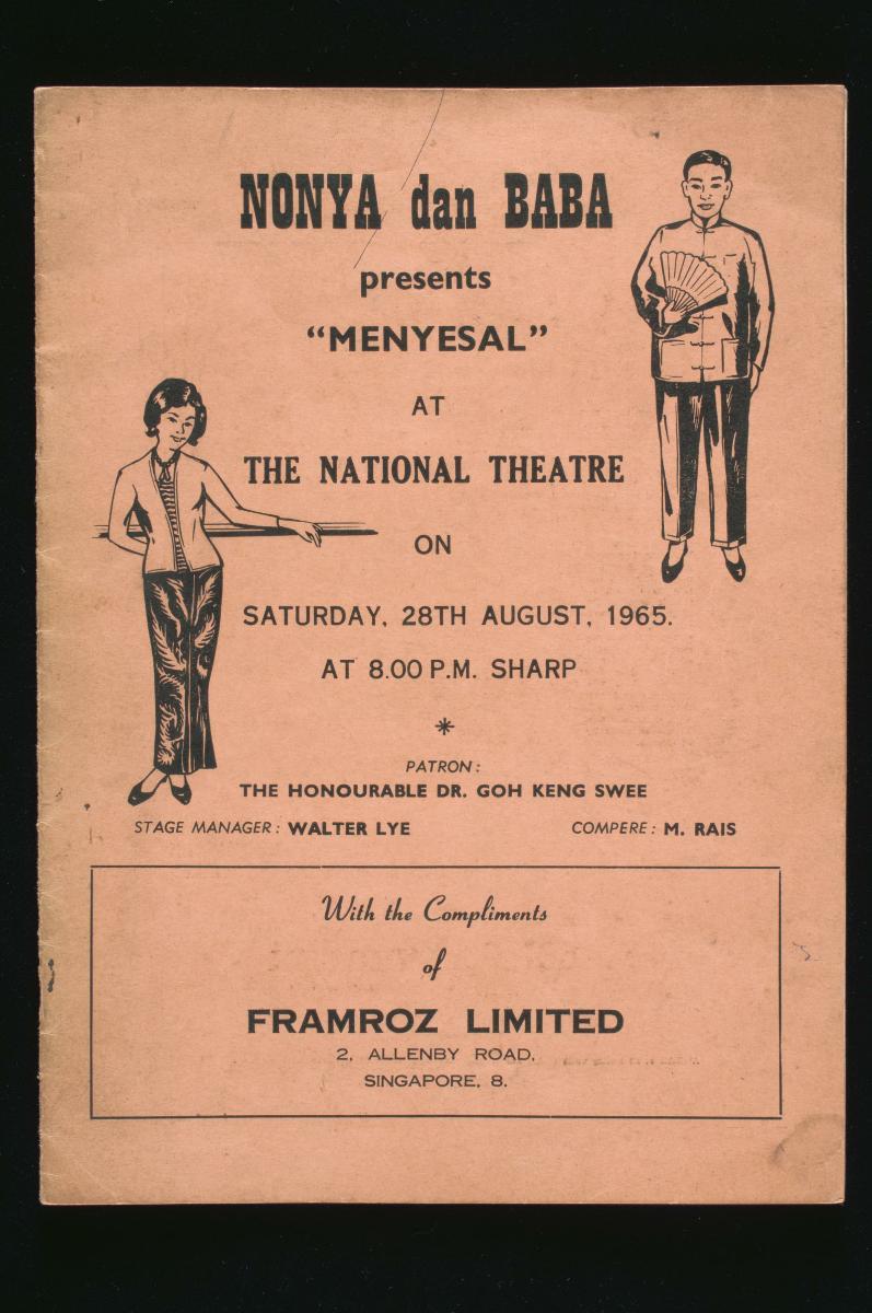 This programme is from one of the spate of plays that were a part of the revival of Peranakan theatre in the 1950s and 1960s, after the Japanese Occupation. Peranakan theatre from this period often featured all-male casts, with female impersonators filling in women’s roles, most notably William Tan, Francis Hogan and Ong Chwee Kim. The plays were put on by amateurs, usually to raise funds for charitable organizations. Malam Peranakan is unlike the plays of the period because it was staged by the Young Women’s Christian Association and features a female cast, highlighting the changing social mores.