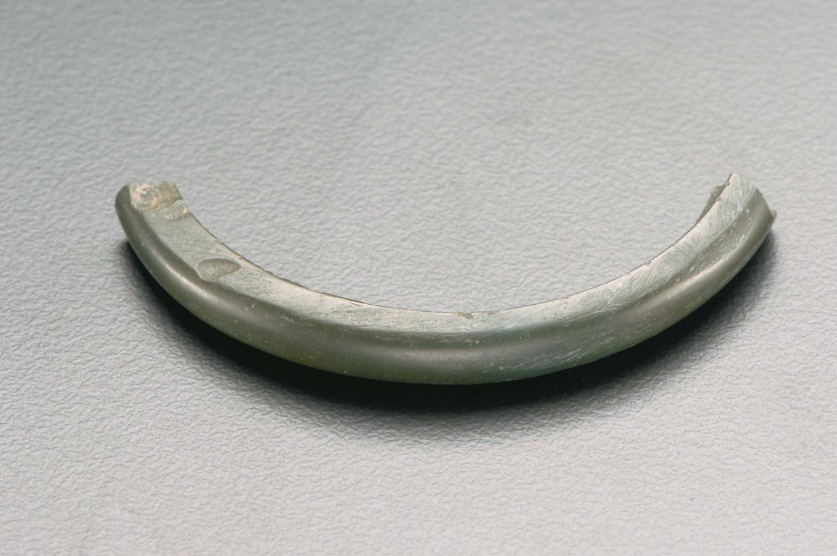 Various types of stone and glass jewellery have been found at neolithic sites across mainland Southeast Asia. They are evidence of technological advances in the way hard stones, probably sourced from riverbeds, were worked to produce status goods. Their wide distribution over long periods of time, also suggest the movement of people and goods in this region. Glass-working would have been a later development. The c-shaped or slit earring for example, is a form found in both stone and glass, associated with Dong Son culture, but also found at sites in Vietnam that date much earlier to the Phung Nguyen culture (2,500 - 1,400 BCE).