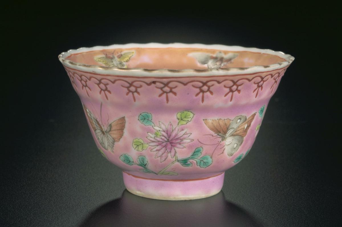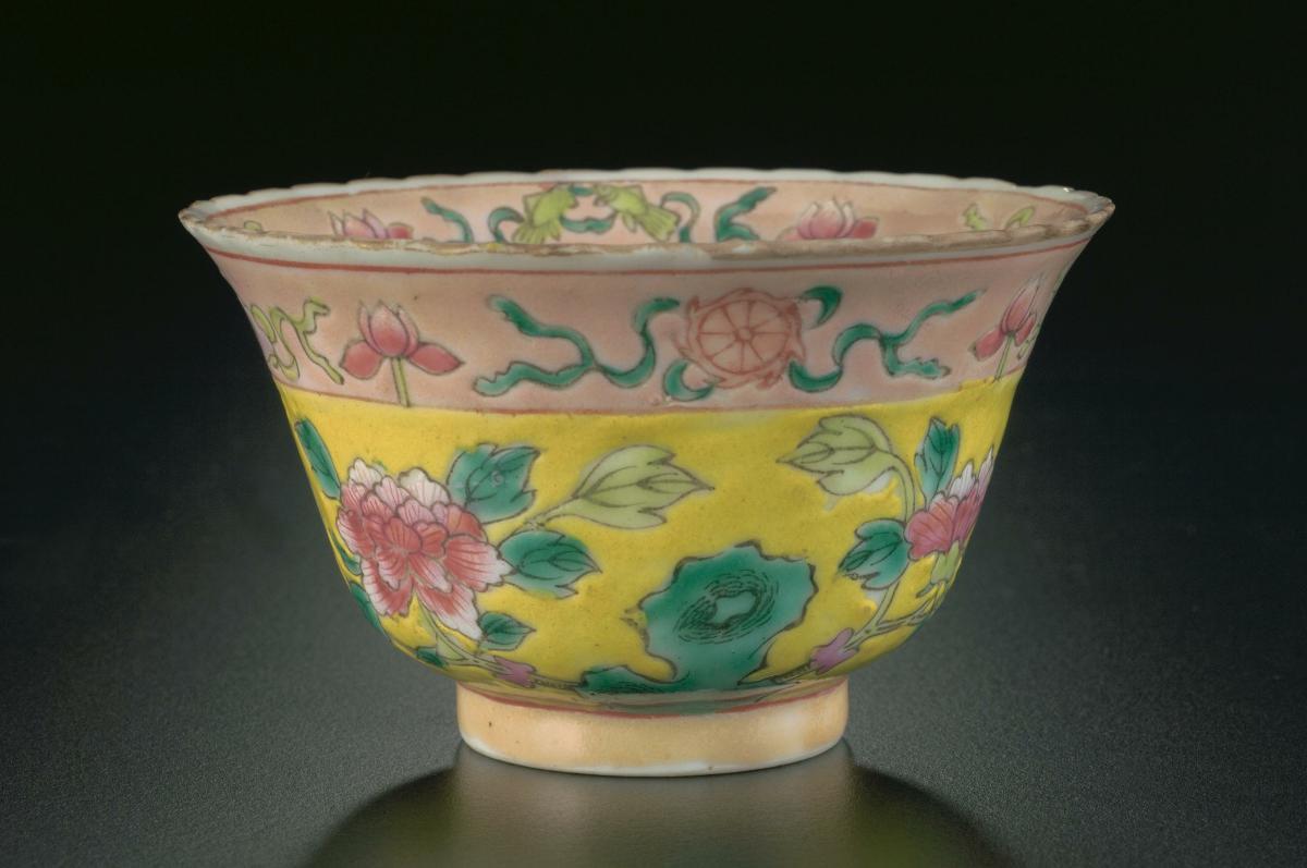 This cup features an engraving of a four-claw dragon interspersed with scrolling floral or cloud motifs on a ring-matt background. Two patterns are present on the bottom and top of the vessel. Circling the rim is a key fret pattern, a popular motif in early Shang art, while a concentric wave pattern borders the foot. Classic Tibetan tea cups were often made from burlwood, sometimes lined or mounted with silver repoussé. They would have been used to serve and drink butter tea, a popular beverage among migratory Tibetans. Silver examples are rare and it is likely that this was a Chinese export piece produced in a similar style in the 18th or 19th century.
