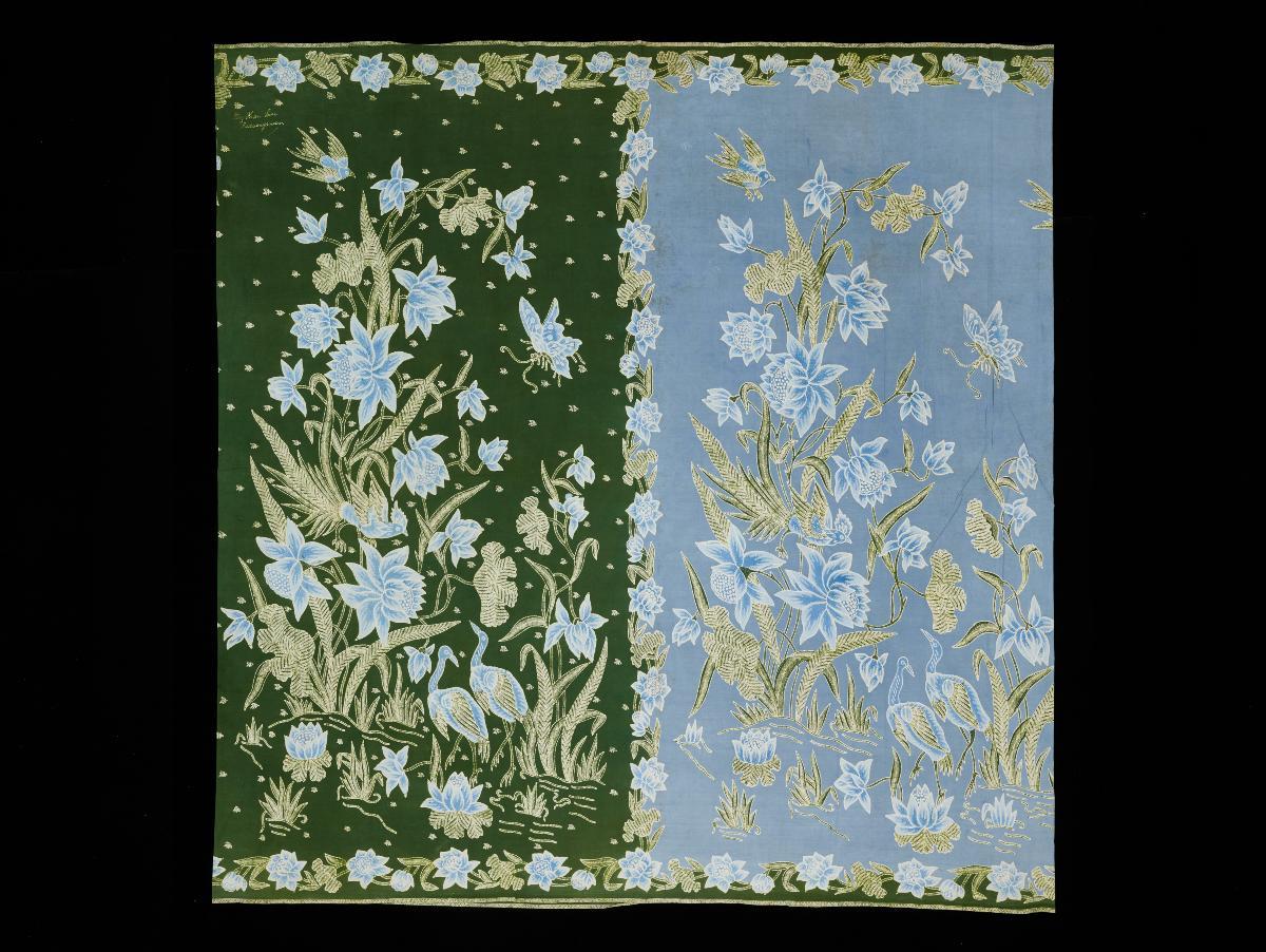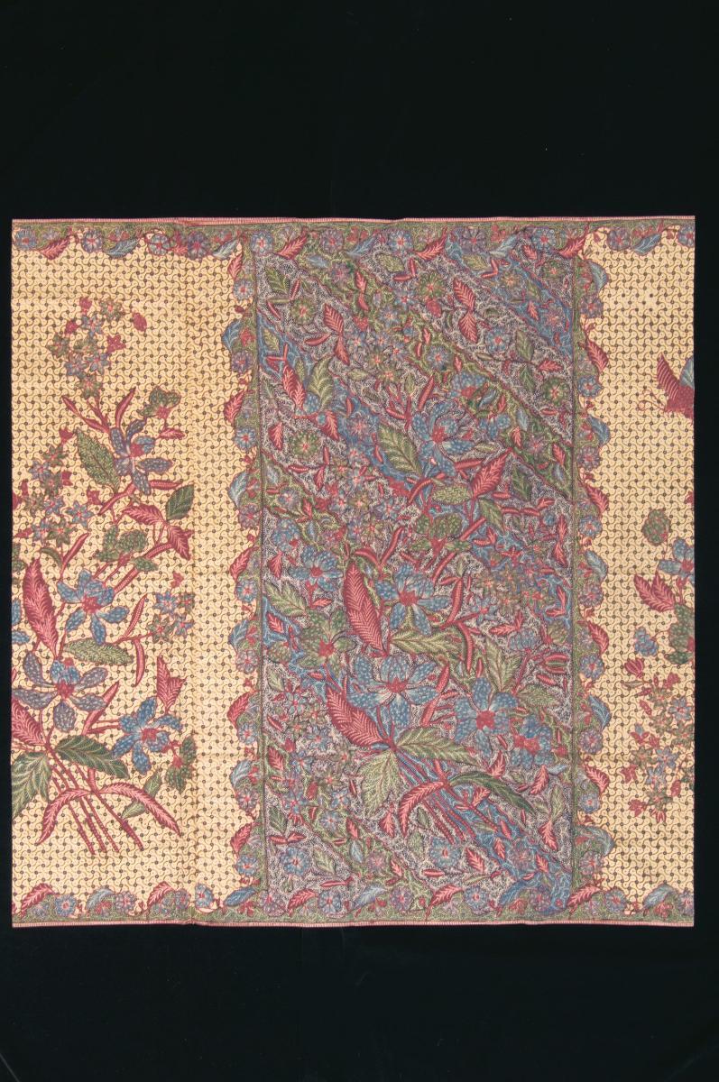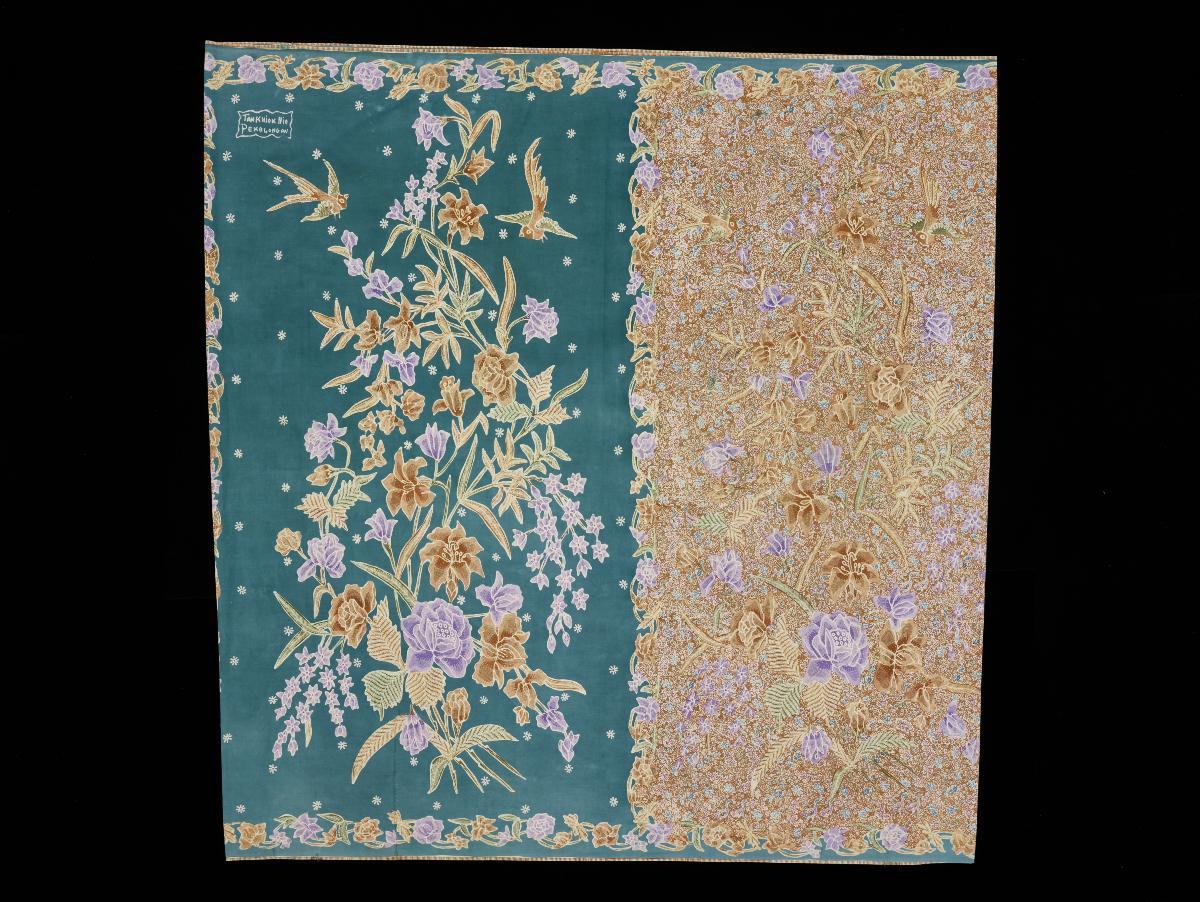 This is a purple and pink sarong with floral motifs. It is a Pekalongan piece signed by atelier Tan Pian Hiow but was acquired from a Cirebon family.This sarong displays the typical motifs and colour schemes popular with Peranakan Chinese communities in Indonesia and the Straits Settlements.