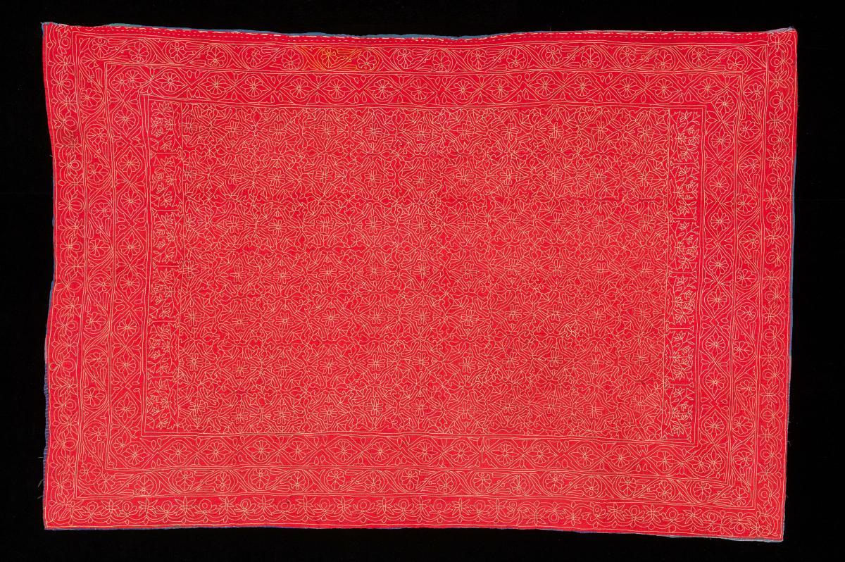 Kantha is quilted embroidery done by the women of Bengal, India. The women create bed spreads, wraps and book or mirror covers among others either for domestic use or as gifts. The Kantha are influenced by the rural scenes, city life and modernisation, mythological scenes or depict floral and vine motifs. They are produced from recycled cloth and yarn of old saris. In this example, large floral motifs palced within squares form a repetitive pattern; flora, fauna and village life being popular subjects in this style of embroidery.
