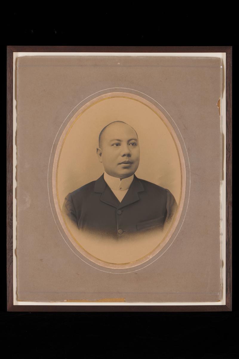 This is a photograph of a lady taken at Gustave Mogle’s studio, at the Hague in Holland. It was acquired in Java. This photo is part of a large group of framed photographs which provides important visual documentation of the fashion, studio photography and lifestyle of Peranakans of the Straits Settlements and Indonesia in the late 19th to mid 20th centuries. Studio photography possibly reached Singapore and the region in the mid 1800s, and Peranakans were among the earliest clients.