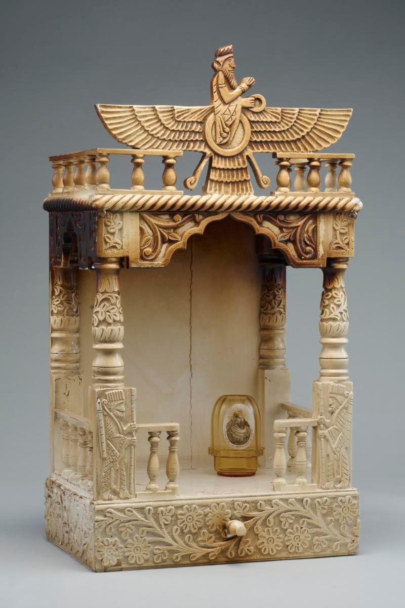 The shrine shows the first Jina, Rishabhanatha, surrounded by twenty three jinas in a holy assembly listening to him preach. His teaching is indicated by the wheel of law flanked by two deer on the base. The clothed jinas and the inscription on the back indicate that the donors, positioned on the base, are from the Svetambara sect. Nine heads positioned on the front are the nine planetary deities. Despite the profusion of figures, the receding planes and pierced nature of the casting make it seem less over-crowded. The architectural elements such as the slender columns add to its refinement.