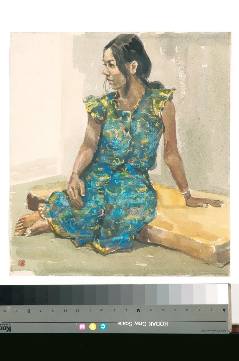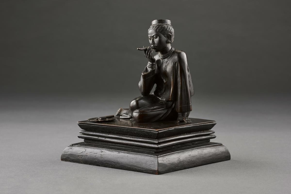Luxury items were popular in the wealthy cities of Kashmir during this period. Small handles in the form of elegant women are known from as early as the Sunga period in India (185-72BC). They were made in bronze and ivory as well as stone. They show the women wearing elaborate jewellery and seated or standing in leisurely poses. A hole in the top suggests it is handle, and they are thought to be mirror handles.On this example the woman is seated and playing a stringed instrument called vina. She wears a long skirt, and jewellery including large, disc-shaped earrings, as well as other beads and bracelets. Two comparable examples from Kashmir and carved in similar stone can be seen in the Metropolitan Museum of Art, New York, 1987.142.39 and 1987.142.35, published in Martin Lerner and Steven Kossak, The Lotus Transcendent: Indian and Southeast Asian Art from the Samuel Eilenberg Collection, New York, 1991, pp. 101-102, figs 69 and 70.