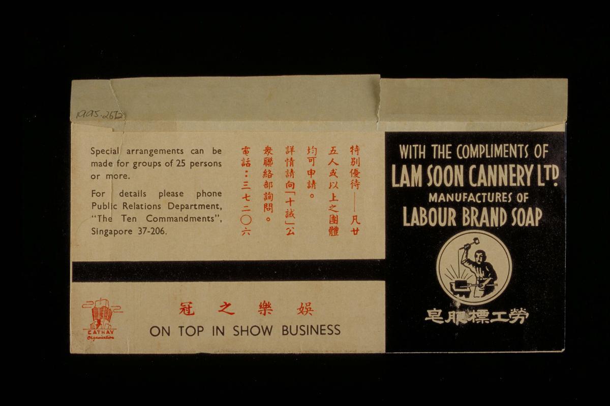Lam Soon Cannery manufactured cooking oil and laundry soap at its Jalan Jurong Kechil factory in the early 1960s. Its first modern factory was opened in Petaling Jaya, Malaya in the 1950s. This receipt from Lam Soon Cannery tells of household consumption in Singapore in the 1960s