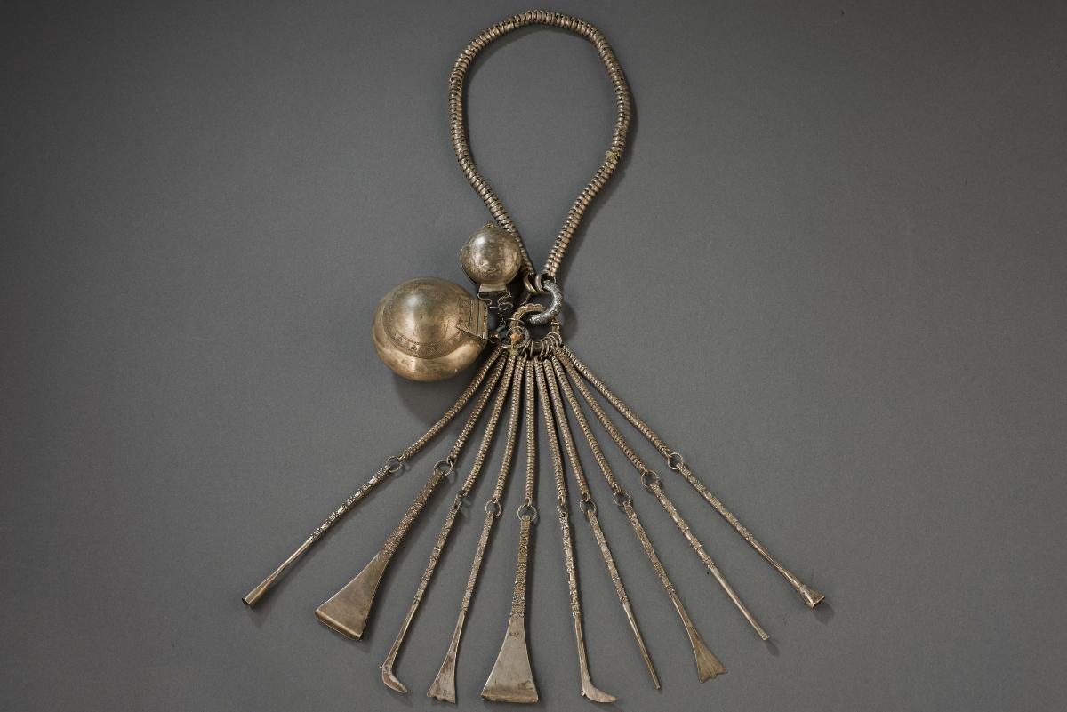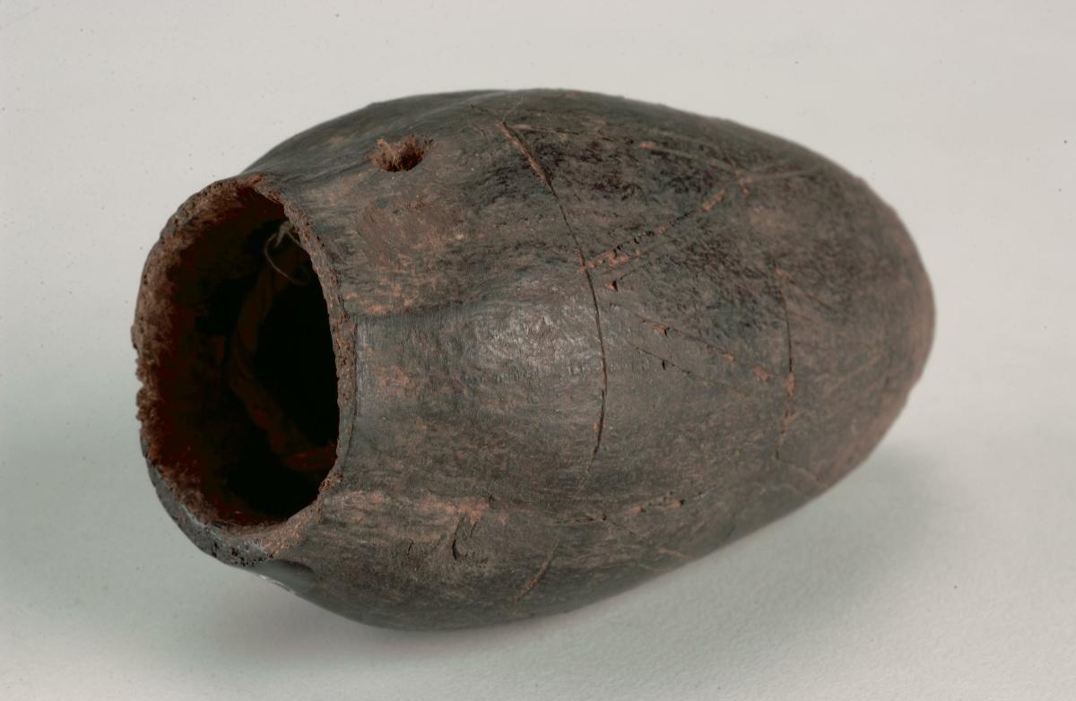 This blue and white hi-ire (container for holding burning charcoal) is decorated with a central circular emblem depicting a Dutch man with various trade ships in the background. There is an inner circle which is decorated with geometric motifs that resemble pseudo Latin alphabet script. The rim is further decorated with a lattice of coin motifs with hanging trefoils. Ceramics used for hi-ire include Chinese and Japanese blue and white porcelains. The bamboo container is known as a hai-otoshi (a container to hold ash and waste). Both objects are usually placed in a small wooden box called a tabako-bon (smoking box). . It is designed to be portable. Such boxes were brought out to a visitor to show the hospitality of the host.
