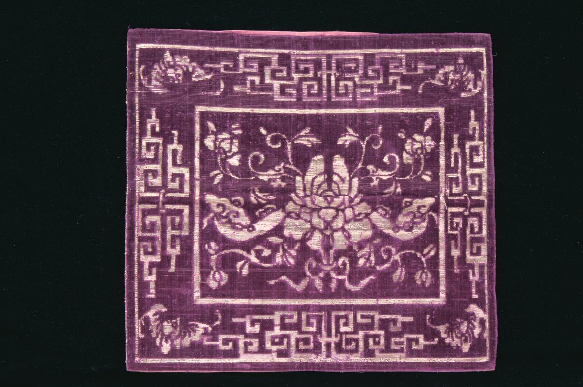 This is one of a pair of long purple and silver metallic thread chair covers with a dragon motif, symbolizing the male, and the eternity knot, a Buddhist emblem at the seat. At the top of the chair cover is the Chinese character for happiness as well as the motif of a bat, a symbol for prosperity. This would have been used together with a cushion cover to adorn chairs meant for important ceremonies during weddings.