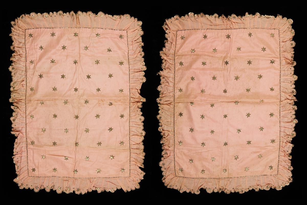 This pair of embroidered pillow cases with beaded edges are meant for the occasion of weddings of Peranakans.