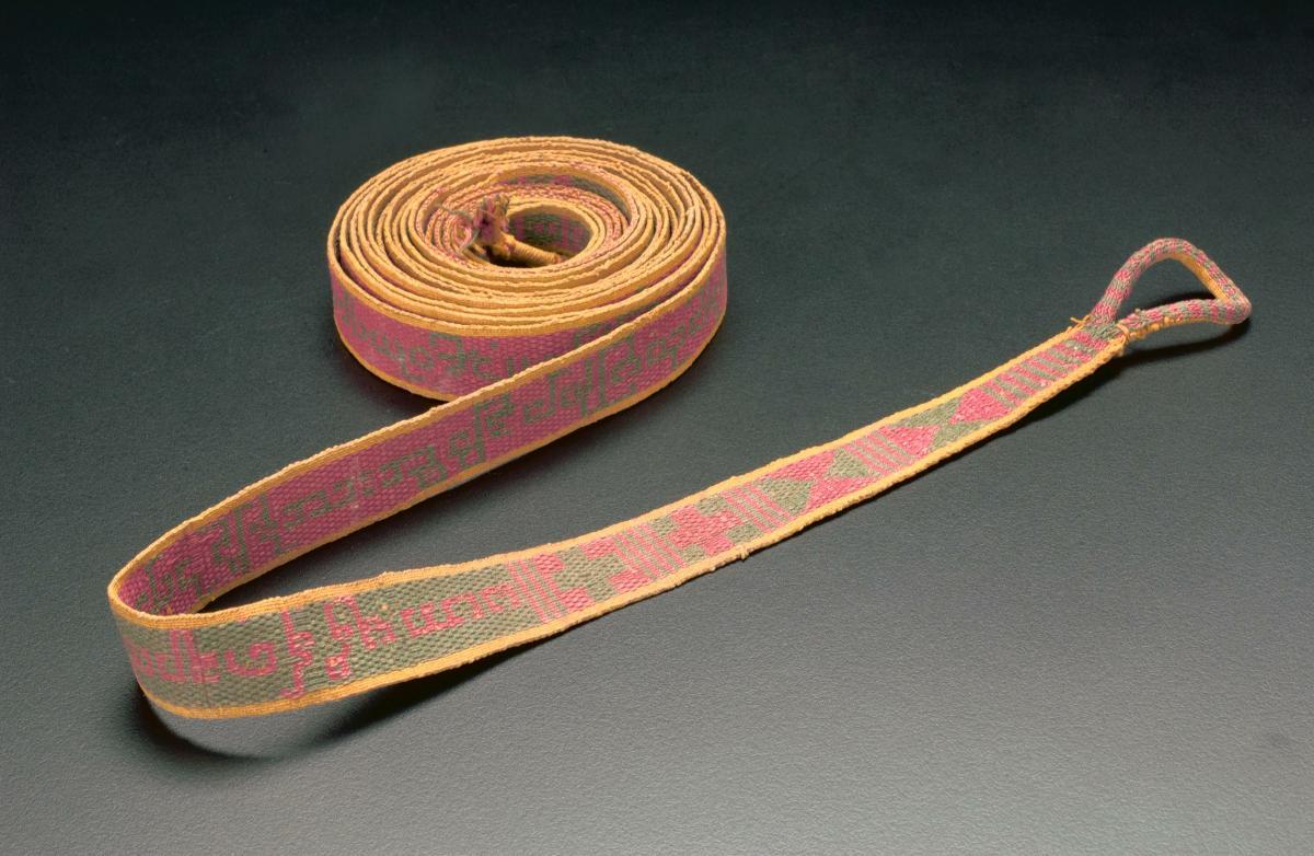 This finely woven red, green and white manuscript binding tape (or sazigyo) has many verses of text interspersed with motifs such as birds, stupas and royal umbrellas. Sazigyo have traditionally been woven by women as acts of merit. ‘Sazigyo’ literally means ‘cord for tying manuscript leaves into bundles’. Women were traditionally barred from entering monastic life as a means of making merit and donations of sazigyo provided an alternative means of doing so. The makers who were commissioned to produce these cords often inserted their own names as well as the donor’s into the weaving. The technique of tablet weaving is complex and time-consuming. Scholars have suggested that the earliest examples date to around the 1780s and that the tradition died out in the 1970s.