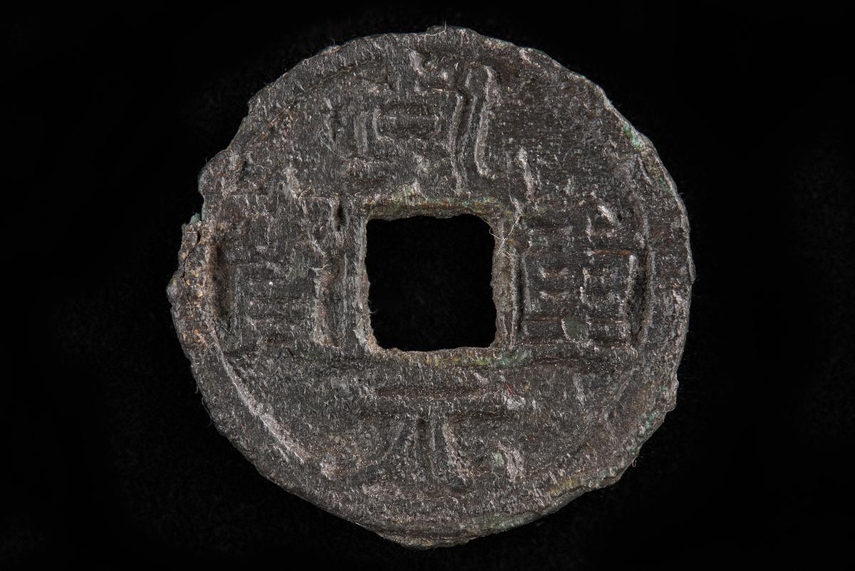 These coins were discovered during the recovery of the Tang Shipwreck, a 9th century vessel that was en route from China back to the Middle East when it sank off the coast of Belitung Island in the Java Sea. The coins were discovered fused together, indicating they had originally been strung together on a length of rope or a rod of wood or metal that passed through the square central hole. The majority of coins have an inscription that reads Kaiyuan tongbao [開元通寶] (containing treasure of the new beginning). This refers to a new coinage system introduced by the first Tang emperor in 621 AD and in continuous use for almost three centuries. After 845 AD, a mark identifying the relevant mint was introduced on the reserve of this type of coinage. Since it is absent from these coins, it indicates they was struck before this date. Nine of the coins have an inscription that reads Qianyuan zhongbao [乾元重寶] (heavy treasure of the Qianyuan era) which indicates they were minted from 758 onwards.