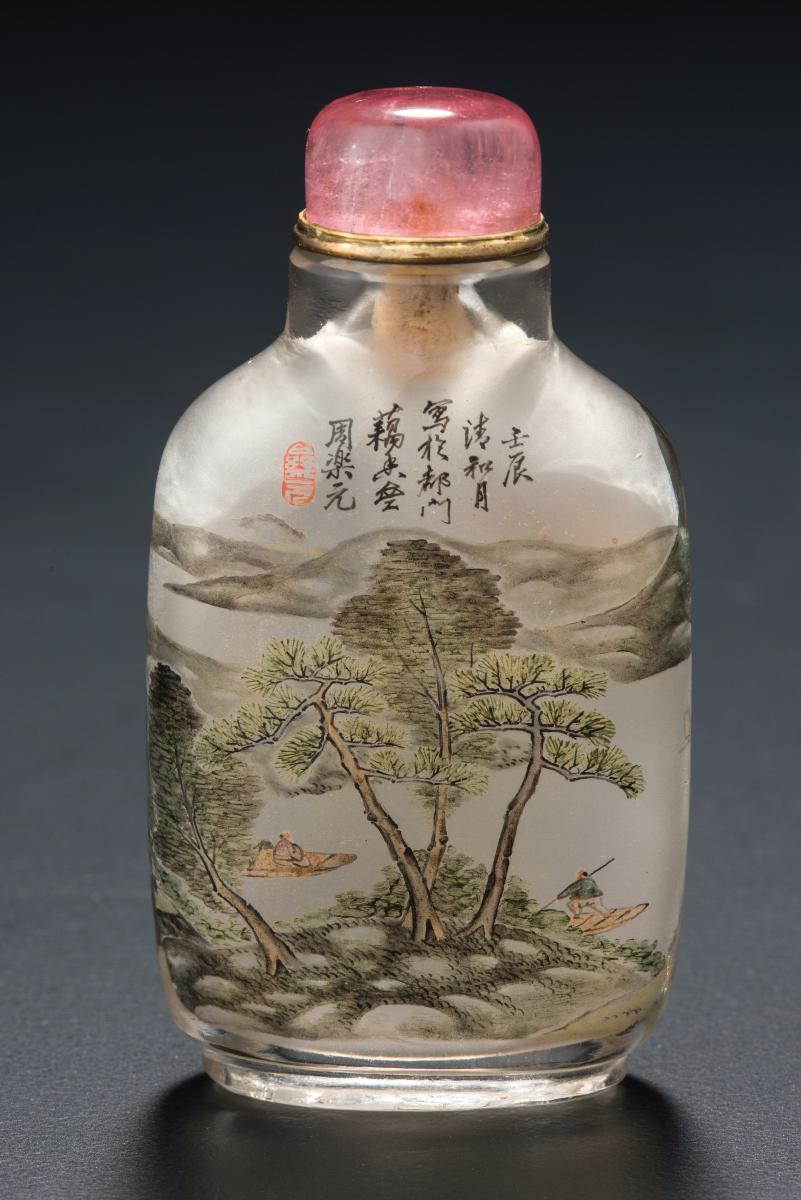 Inside-painted snuff bottles were first produced in the early 19th century and collected for their aesthetic sensibilities than utilitarian function. This rock crystal snuff bottle of miniature flattened rectangular shape is painted on the inside with mountain landscapes and signed, 'Song Xuan Zhuren zuo' (松轩主人作). More research is required on the identity of the painter.