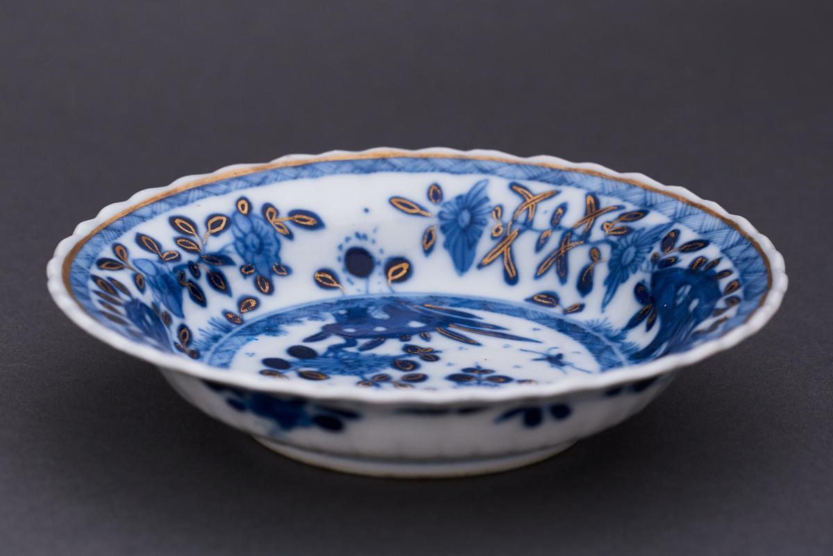 This gilded blue-and-white dish with a central panel depicts peonies and rockery, with a surrounding band of lingzhi fungus and other plants. It is one of the less common blue-and-white designs used by Peranakans. This is part of a large group of porcelain that came from the house of Panglima Prang (c. 1860), formerly located on River Valley road in Singapore. Two prominent Peranakans in the Tan family include Tan Kim Seng (1805-1864) and Tan Jiak Kim (1859-1917). Both were highly regarded businessmen, community leaders and philanthropists in their time.