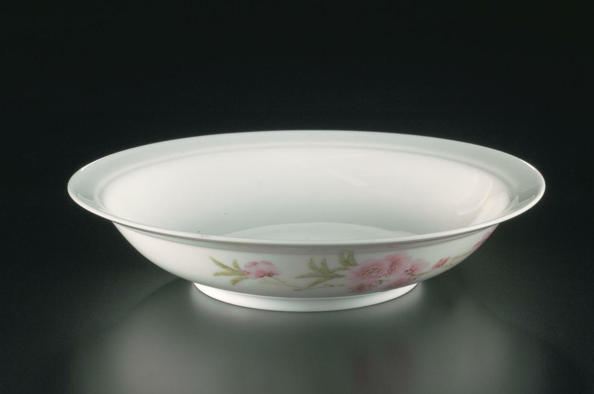 This finely-painted blue and white dish has a central scene featuring a trio of music-playing Europeans in a garden setting. The design is derived from an engraving by a French artist, Nicolas Bonnart (1646–1718), who based it on a print by his brother, Robert Bonnart. This print is one of a number of French costume prints portraying women with elaborate hair styles that were in vogue at the time. Surrounding this main design are eight panels featuring Chinese-style landscapes. This combination of Chinese and European elements highlights the exchanges between the two regions. It also illustrates the Western fascination with the East as such dishes were likely to have been commissioned by European traders for export to their home countries.