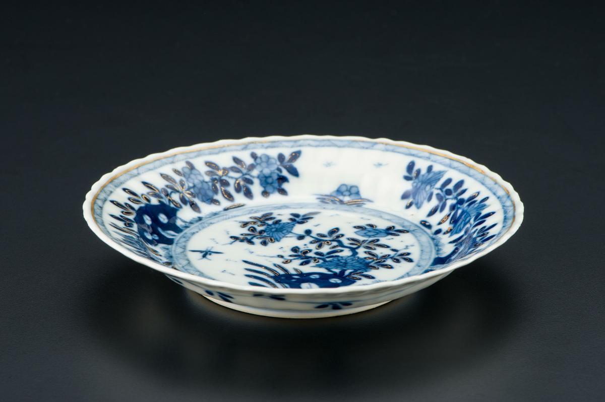 This gilded blue-and-white dish with a central panel depicts peonies and rockery, with a surrounding band of lingzhi fungus and other plants. It is one of the less common blue-and-white designs used by Peranakans. This is part of a large group of porcelain that came from the house of Panglima Prang (c. 1860), formerly located on River Valley road in Singapore. Two prominent Peranakans in the Tan family include Tan Kim Seng (1805-1864) and Tan Jiak Kim (1859-1917). Both were highly regarded businessmen, community leaders and philanthropists in their time.