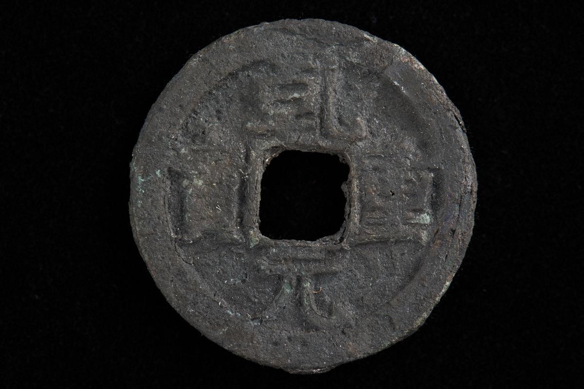 These coins were discovered during the recovery of the Tang Shipwreck, a 9th century vessel that was en route from China back to the Middle East when it sank off the coast of Belitung Island in the Java Sea. The coins were discovered fused together, indicating they had originally been strung together on a length of rope or a rod of wood or metal that passed through the square central hole. The majority of coins have an inscription that reads Kaiyuan tongbao [開元通寶] (containing treasure of the new beginning). This refers to a new coinage system introduced by the first Tang emperor in 621 AD and in continuous use for almost three centuries. After 845 AD, a mark identifying the relevant mint was introduced on the reserve of this type of coinage. Since it is absent from these coins, it indicates they was struck before this date. Nine of the coins have an inscription that reads Qianyuan zhongbao [乾元重寶] (heavy treasure of the Qianyuan era) which indicates they were minted from 758 onwards.