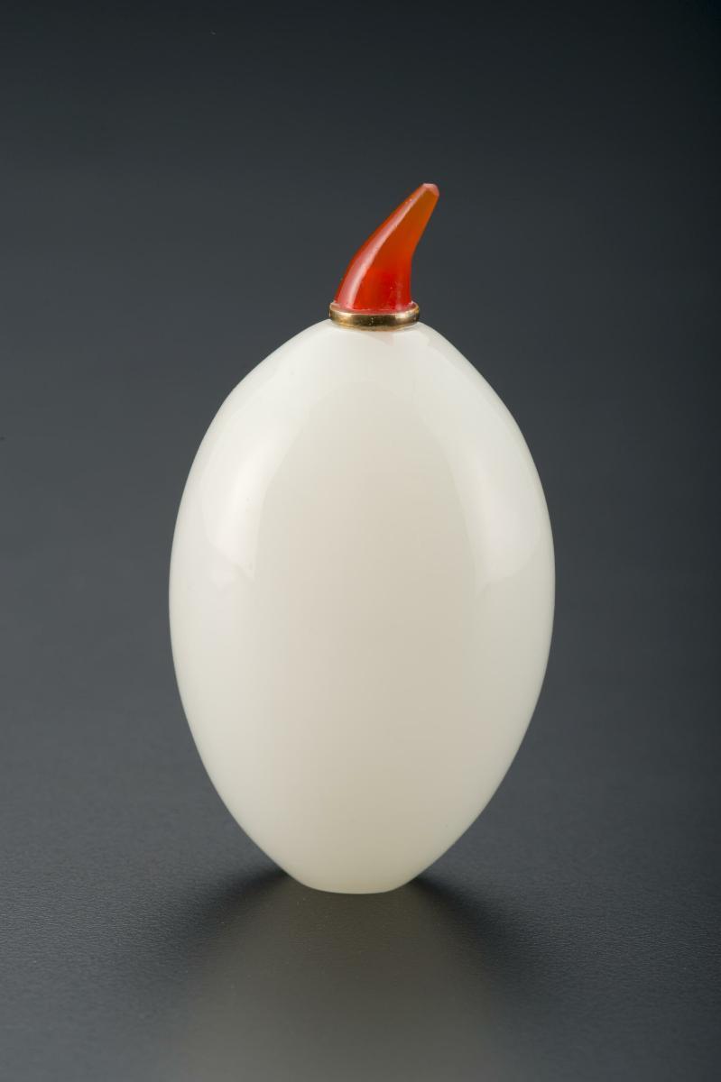 This ovoid puddingstone snuff bottle is supported on a raised foot-rim; its beige matrix suffused with greyish chips of quartz. The variation in shape and size of the chips creates a strong visual impact, which complements the simple form of the bottle. Puddingstone is the generic term for a conglomerate of sedimentary flint pebbles in a matrix of chert (a dense rock composed mainly of microcrystalline quartz).