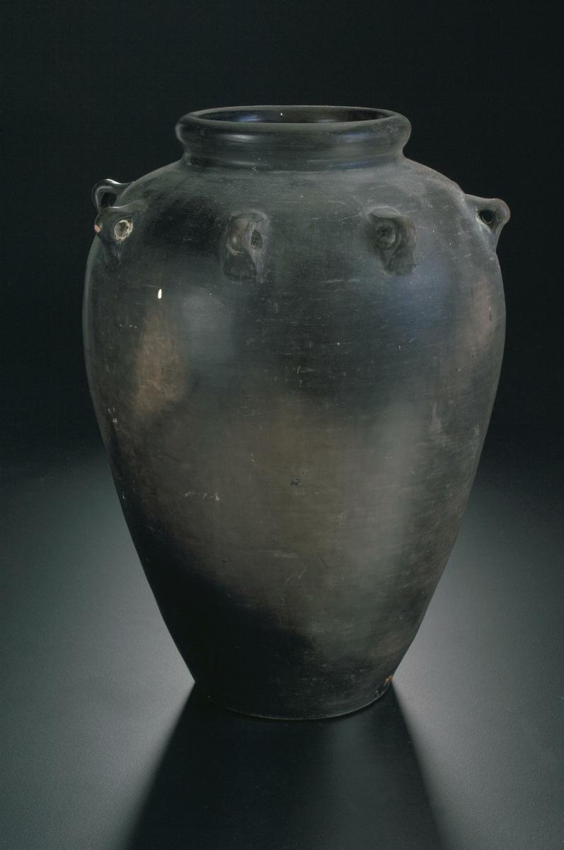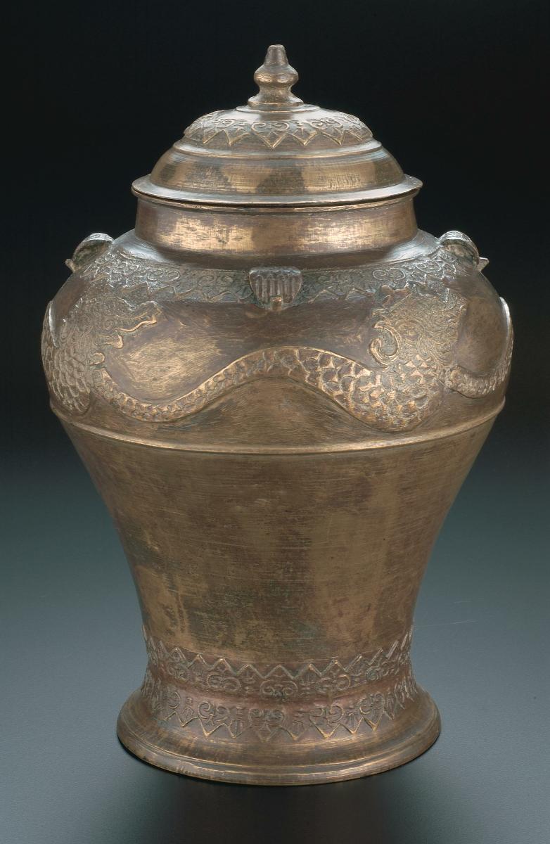 This type of lug-handled storage jar is often called a ‘Martaban Jar’, after the port town of Martaban on the Andaman Sea on the southern coast of Myanmar, the most likely origin of this piece. With its rich brown glaze, paddle-beaten coils just under the surface, and raised slip trails this piece may have attempted to emulate metal ware objects of the period. These jars have a history dating back to at least the 14th century, although glazed ceramics may have been produced in the region as early as the 11th century.
