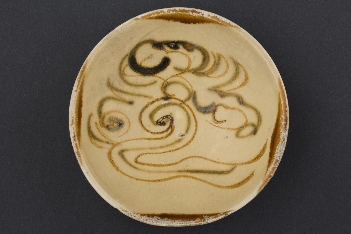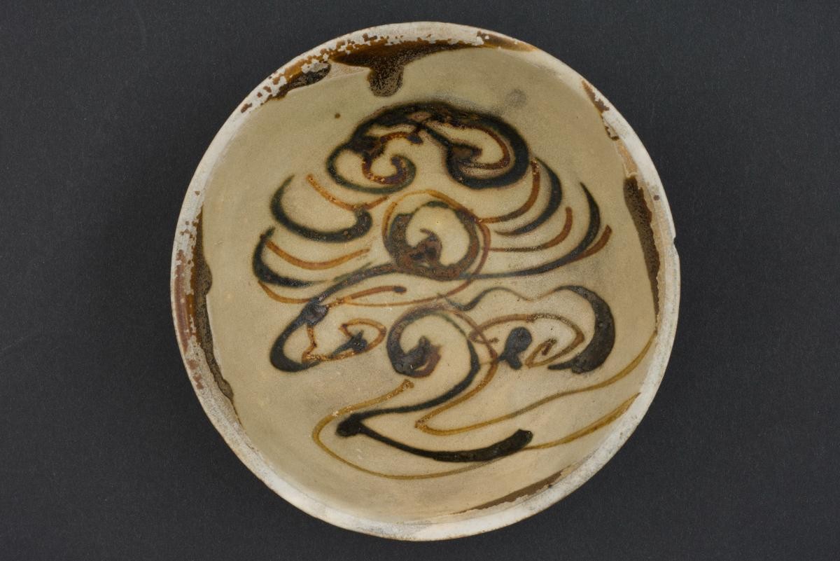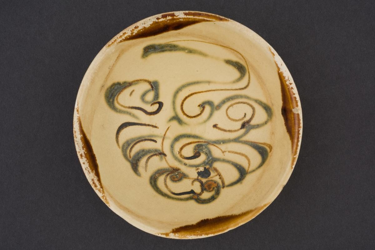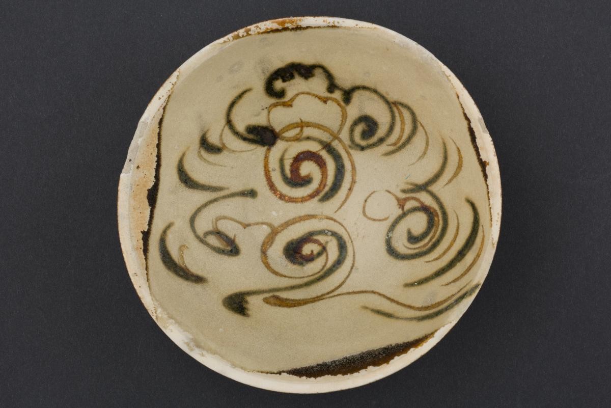 This stoneware bowl was made in the Changsha kilns of Southern China around the 830s. These kilns produced ceramics on an industrial scale. Because they were painted by many different artists, the patterns vary greatly. The brown patches framing the designs were applied speedily by dipping the rims of the bowls into glaze. Common designs include clouds, landscapes, birds, flowers, foliage, and spirals. This particular example has a cloud motif.