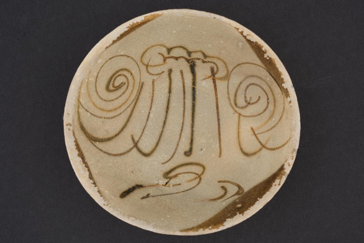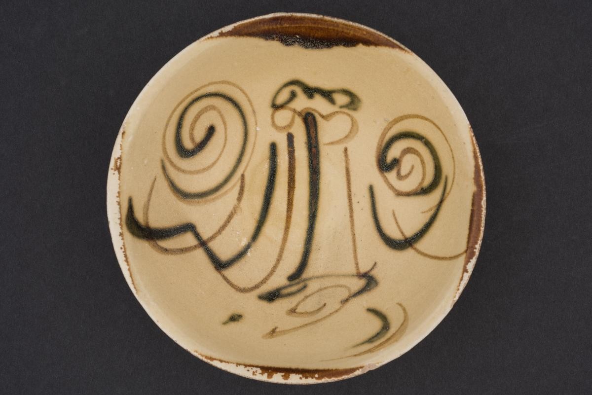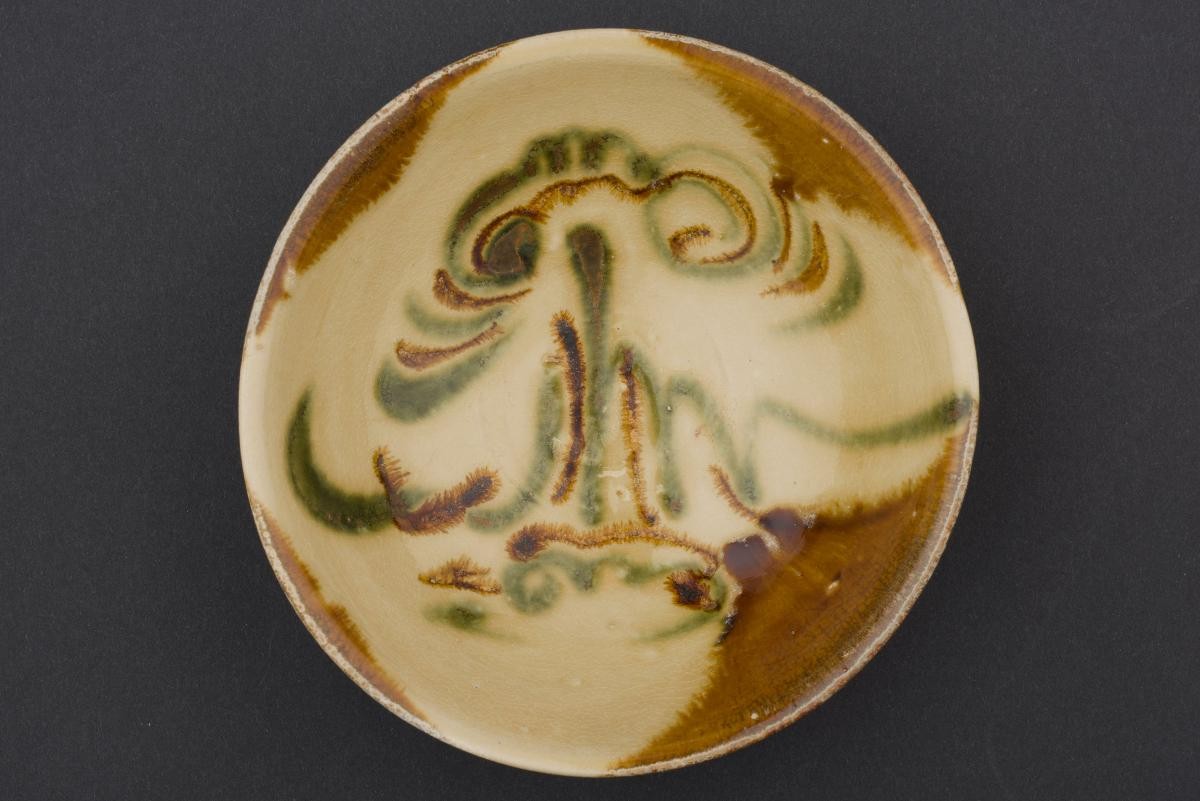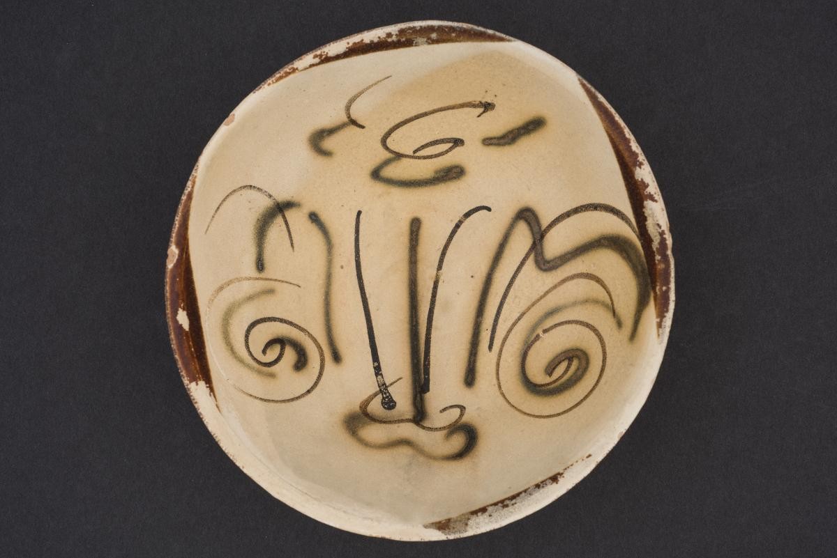 This stoneware bowl was made in the Changsha kilns of Southern China around the 830s. These kilns produced ceramics on an industrial scale. Because they were painted by many different artists, the patterns vary greatly. The brown patches framing the designs were applied speedily by dipping the rims of the bowls into glaze. Common designs include clouds, landscapes, birds, flowers, foliage, and spirals. This particular example depicts a mountain landscape and clouds.