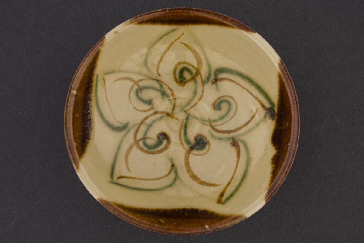 This stoneware bowl was made in the Changsha kilns of Southern China around the 830s. These kilns produced ceramics on an industrial scale. Because they were painted by many different artists, the patterns vary greatly. The brown patches framing the designs were applied speedily by dipping the rims of the bowls into glaze. Common designs include clouds, landscapes, birds, flowers, foliage, and spirals. This particular example has a five-petal flower.