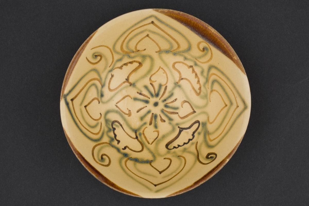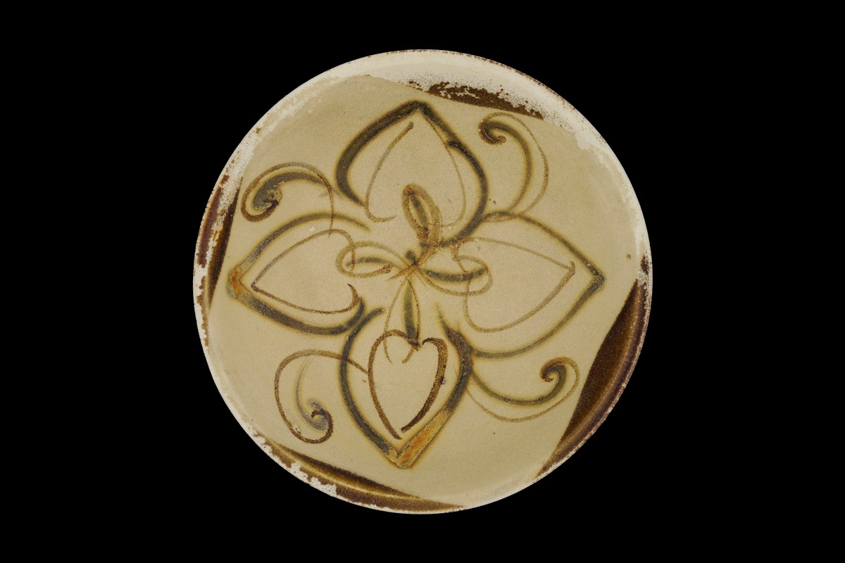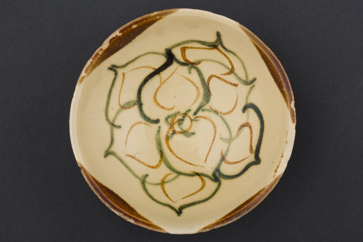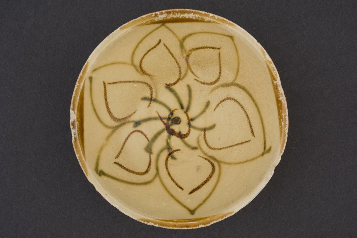 This stoneware bowl was made in the Changsha kilns of Southern China around the 830s. These kilns produced ceramics on an industrial scale. Because they were painted by many different artists, the patterns vary greatly. The brown patches framing the designs were applied speedily by dipping the rims of the bowls into glaze. Common designs include clouds, landscapes, birds, flowers, foliage, and spirals. This particular example has a floral motif with spiral-shaped petals. The spirals seem to continuously wind around a fixed point.