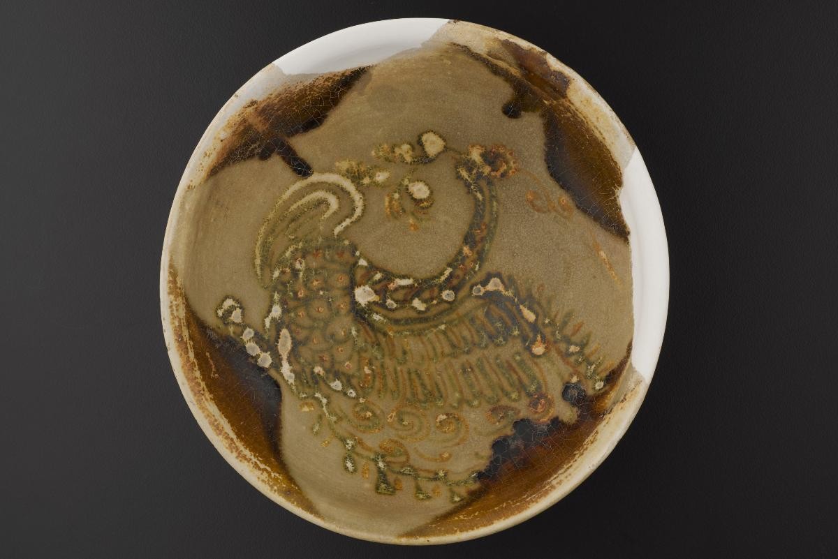 This stoneware bowl was made in the Changsha kilns of Southern China around the 830s. These kilns produced ceramics on an industrial scale. Because they were painted by many different artists, the patterns vary greatly. The brown patches framing the designs were applied speedily by dipping the rims of the bowls into glaze. Common designs include clouds, landscapes, birds, flowers, foliage, and spirals. This particular example has a bird motif. The splendid plumage and the circular markings on its tail feathers alludes to the peacock.