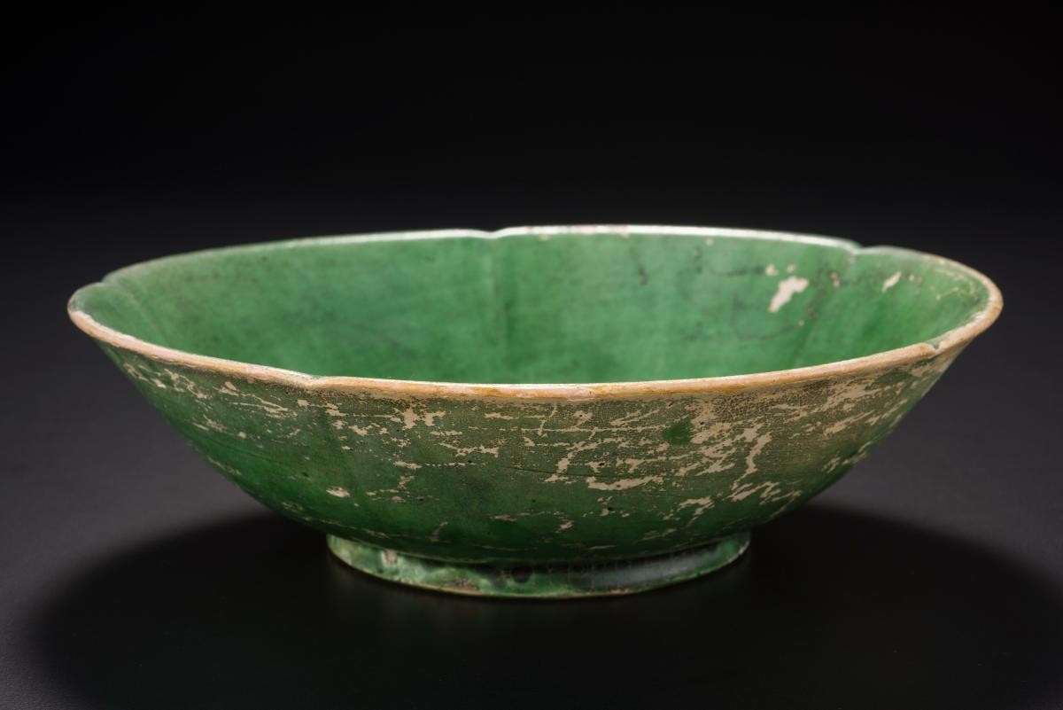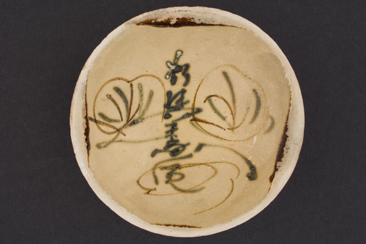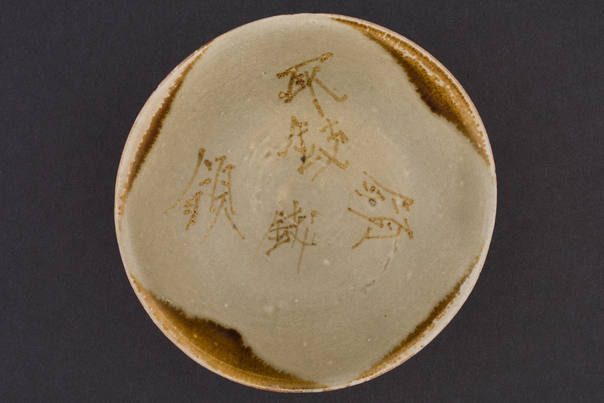 This stoneware bowl was made in the Changsha kilns of Southern China around the 830s. These kilns produced ceramics on an industrial scale. Because they were painted by many different artists, the patterns vary greatly. The brown patches framing the designs were applied speedily by dipping the rims of the bowls into glaze. Common designs include clouds, landscapes, birds, flowers, foliage, and spirals. This particular example has an inscription in cursive script.
