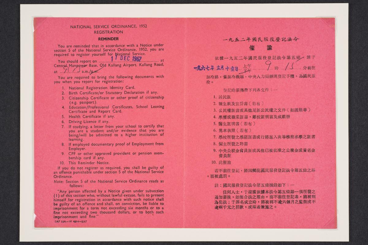 This call-up notice was addressed to Mr William Oh, informing him of the sending-off party that would be organised for him and other national service enlistees at Geylang Serai Community Centre before being transported to the Central Manpower Base at Kallang.