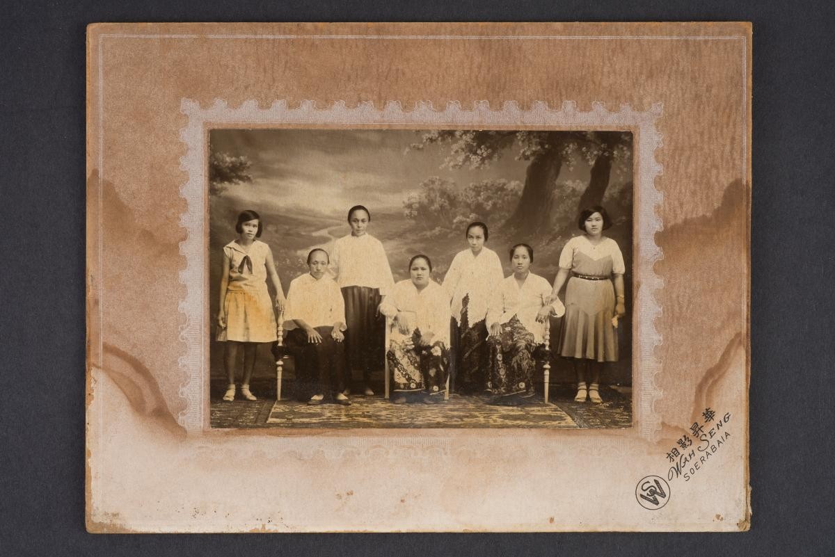 This is a studio portrait of three nyonyas in sarong kebaya. This large group of photographs provides important visual documentation of the fashion, studio photography and lifestyle of Peranakans of the Straits Settlements and Indonesia in the late 19th to mid-20th centuries. The collection also allows study of different photographic techniques and covers a wide range of themes, including changing fashions (from baju panjang and baju kurong to kebaya and cheongsam), festive celebrations (weddings, funerals, ancestral rites, Chinese New Year), interiors, transportation and children.
