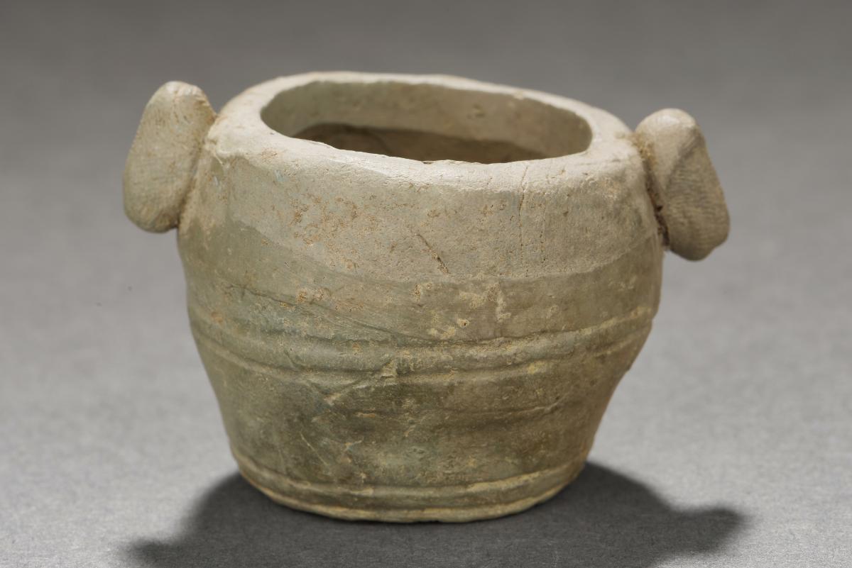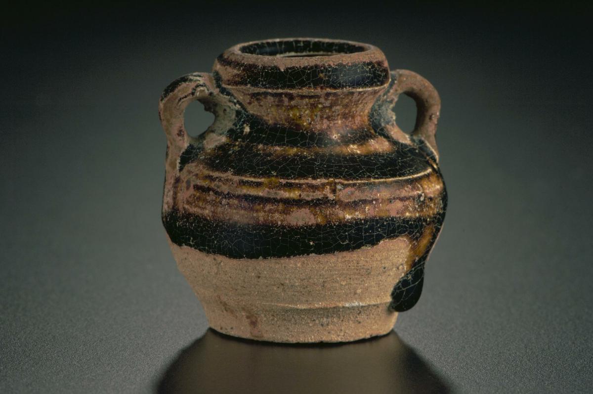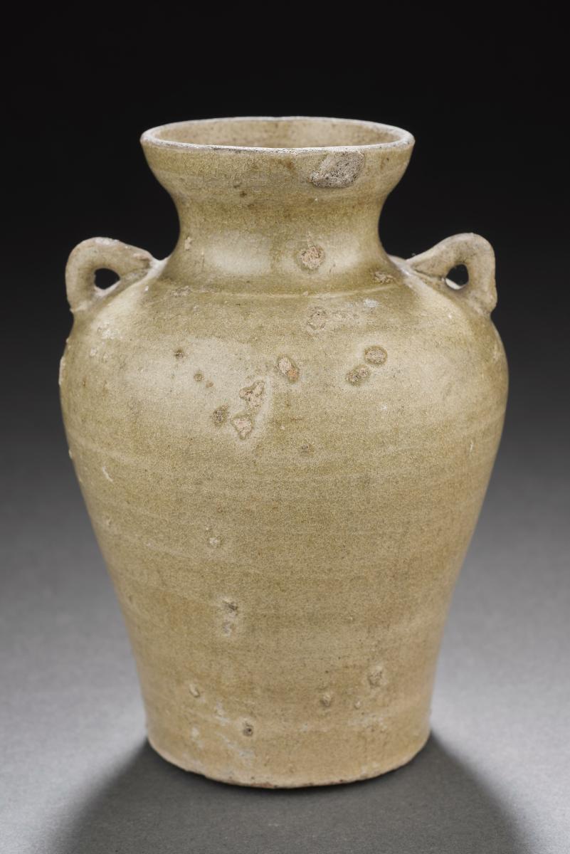 This globular jarlet with a slightly everted rim, has a pair of loop handles on the shoulders. It is covered with a lightly-crackled, olive-green glaze. Northern Thailand was a production centre of high-quality glazed ceramics from the early fourteenth to mid-sixteenth century. The kiln sites of Sankampaeng, 25 km east of Chiang Mai, were discovered around the mid-20th century. The Sankampaeng kiln complex was the second most extensive in the Lanna kingdom, and made mostly monochrome brown or celadon wares, brown and green wares, and underglazed double-fish design bowls. Wares were stacked rim-to-rim for firing, and so have characteristically unglazed rims and bases.