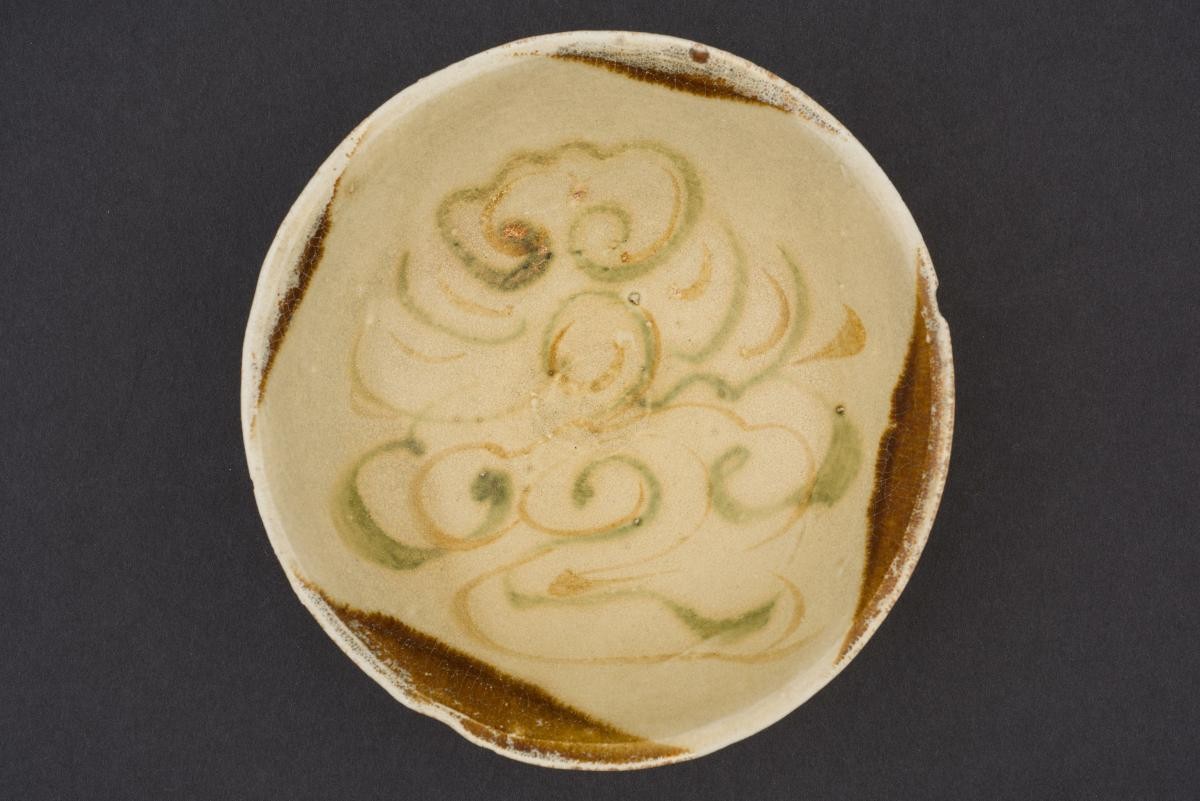 This stoneware bowl was made in the Changsha kilns of Southern China around the 830s. These kilns produced ceramics on an industrial scale. Because they were painted by many different artists, the patterns vary greatly. The brown patches framing the designs were applied speedily by dipping the rims of the bowls into glaze. Common designs include clouds, landscapes, birds, flowers, foliage, and spirals. This particular example has a cloud motif. The distinct mushroomlike head and swirling tail is emphasized by the simplicity and spontaneity of the design.