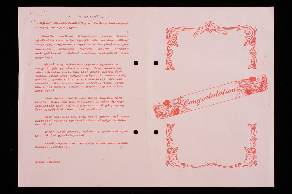 Prior to the World War II period, Indians in Singapore and Malaya retained strong political, sentimental and economic ties with their home country. Anti-colonial thoughts and actions, inspired by the “call for freedom” in India, resonated in the region too. Radio broadcasts, newspaper reports and visits by nationalist leaders strengthened the nationalistic mood among the migrant Indian community. The Indian National Army and Netaji Subhas Chandra Bose brought to the fore this spirit of nationalism. This collection provides rare documentary evidence of the involvement of the region's Indian community in the Indian National Army and the Indian Independence League, the army's fund raising arm. This is a rare notice printed by Indian Independence League, Malacca Branch, to a resident of Indian origin (Chettiar) for the purpose of asset assessment.