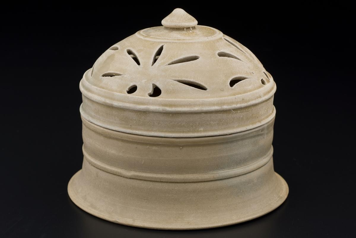 Chinese green ceramics such as this incense burner from the Tang Shipwreck are called celadons (青瓷) and were highly prized by foreign clients, and they have been found in many sites in Southeast Asia and the Middle East. Green-glazed stoneware was a specialty of southern China. The finest works (from the Yue kilns in Zhejiang province) were compared to jade. This was not only because of their colour, but also because they made a ringing tone when struck. The Yue kilns produced only a limited number of high-quality celadons. Other kilns attempted to copy these green wares, but the results were rougher. Incense burners usually accompanied tea sets due to their use in Buddhist meditation. The Tang Shipwreck was a 9th century vessel that was en route from China back to the Middle East when it sank off the coast of Belitung Island in the Java Sea.