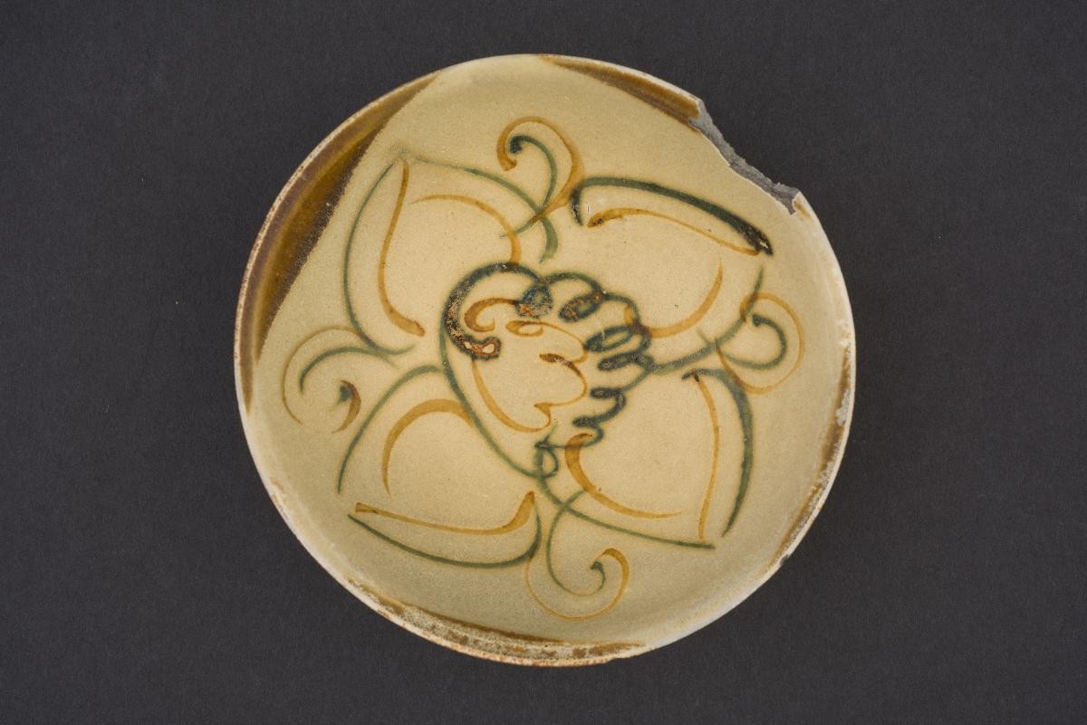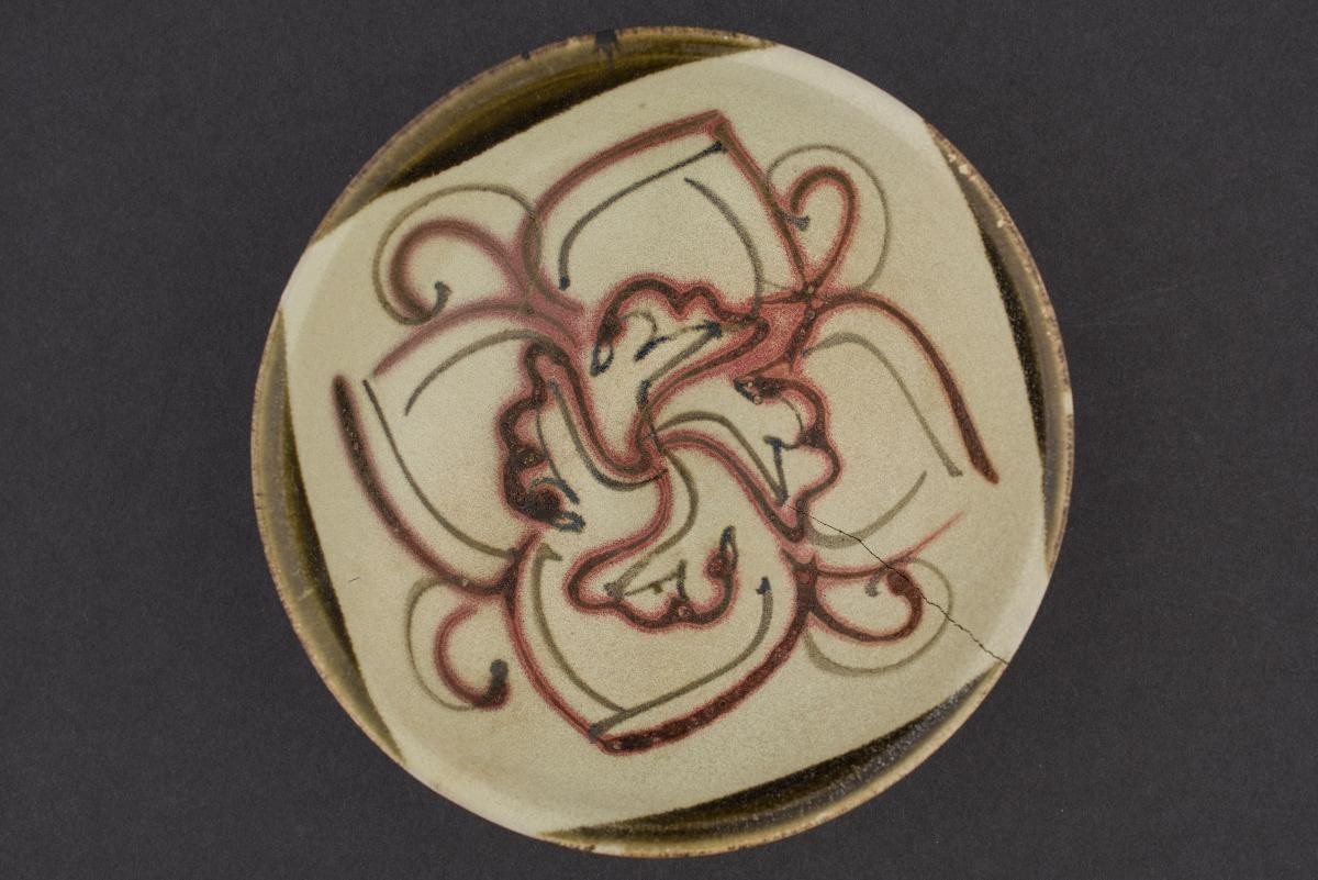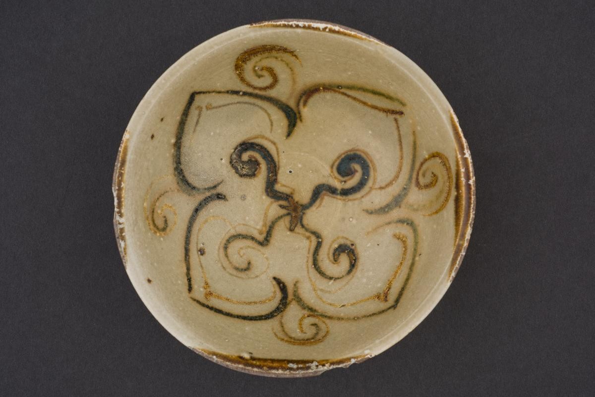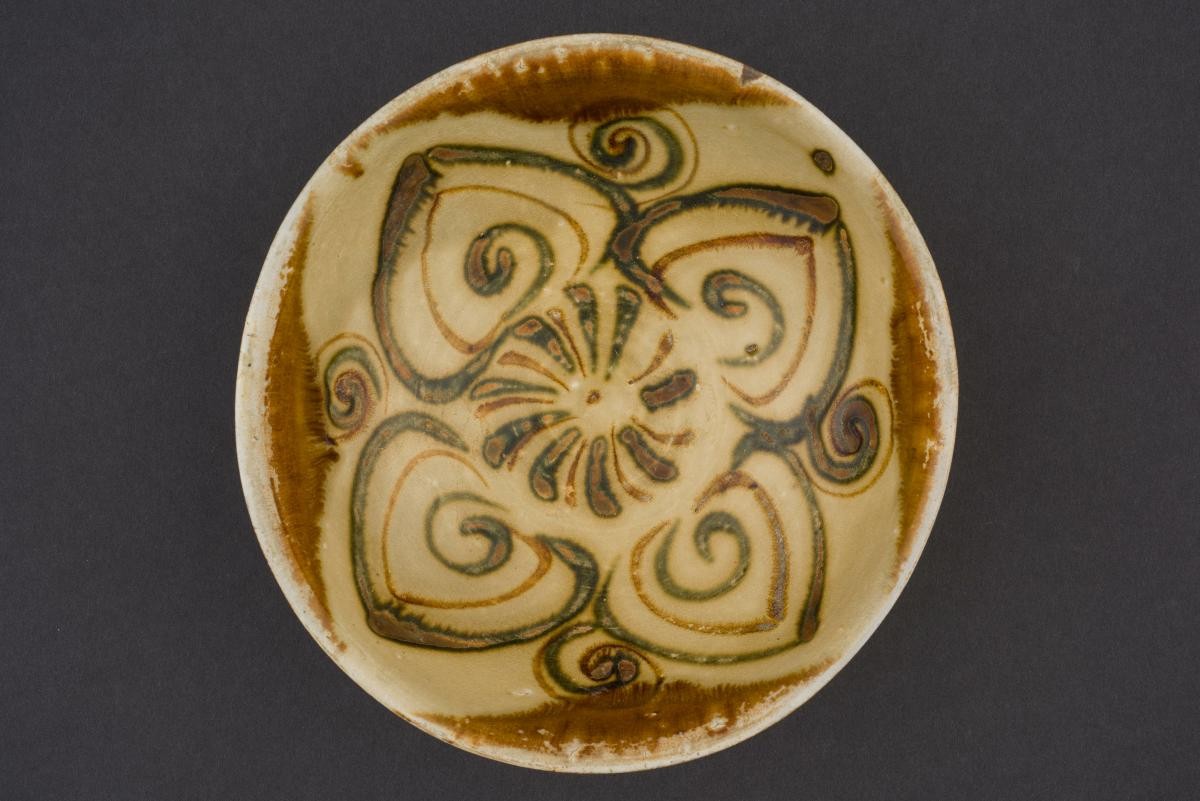 This stoneware bowl was made in the Changsha kilns of Southern China around the 830s. These kilns produced ceramics on an industrial scale. Because they were painted by many different artists, the patterns vary greatly. The brown patches framing the designs were applied speedily by dipping the rims of the bowls into glaze. Common designs include clouds, landscapes, birds, flowers, foliage, and spirals. This particular example has a four-petal flower.
