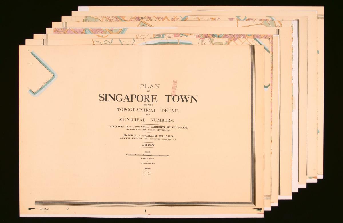 This is a plan of the town of Singapore, produced in 1893. It contains 8 sheets in four frames, and shows topographical details of Singapore's landscape. It was produced by Governer Cecil Clement Smith and Major H.E. McCallum, who was an engineer and surveyer general.