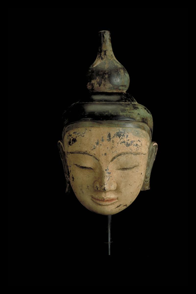 This is an outstanding andesite Buddha Head depicted with a full, round face, downcast eyes, arched eyebrows, raised urna, bow-shaped mouth, aquiline nose, distended earlobes and snail-shell hair curls turned clockwise covering the head and ushnisha. The overall rendition is a superlative example of the Buddhist art of Central Java. This piece closely resembles the seated Dhyani Buddhas that punctuate the circumambulatory terraces of Borobudur. Borobudur, one of the greatest Buddhist monuments in the world, is a colossal late 8th to early 9th century CE stupa-like edifice built in the form of a three dimensional mandala. Stylistically the facial features of the Buddha sculptures of Borobudur remain close to the Gupta style of Northern India with their mouth and eye lid shapes or hair in snail-shell curls obviously inspired by the great classical style of the Subcontinent.This piece is from the collection of Karl Ernst Osthaus (1874–1921) an eminent German collector, art patron and philanthropist who in 1902 founded the Folkwang Museum of Hagen. A visionary collector and pioneer, this Javanese Buddha Head was accquired by him in the early 20th century. The base seen here was originally designed for display at his museum.