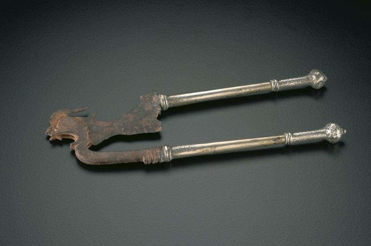A charming betel nut cutter in the form of an amorous (mithuna) couple. Both figures are seated on scrolling leaf handles with lotus bud finials. Parrots, indicating love, are perched on the inside of the handles. As the cutters open the figures kiss, and as they close the male figure caresses the breast of the female.Such single blade cutters are used in the practice of betel nut chewing. The practice is thought to originate in Southeast Asia, dating back to prehistoric times. It is first mentioned in texts dating to early centuries AD. It migrated from there to India and is still a practice all over Asia and the Middle East.