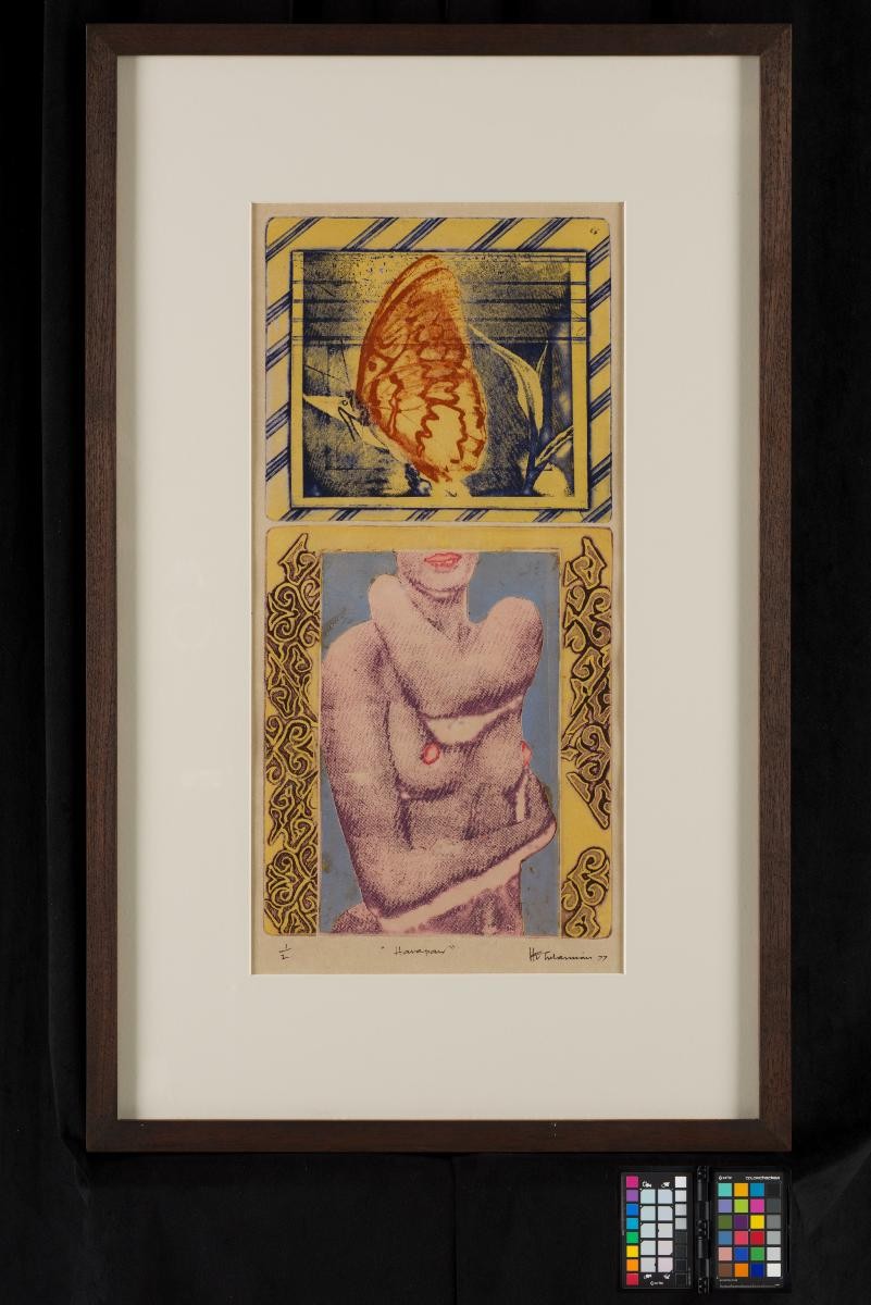 Executed in a realistic and figurative style, Voices of Hope vividly articulates and images the contemporary reality facing tribal and rural communities. Divided into nine panels that each contains a single image, the montage comes together to articulate the quandary of Sarawak's indigenous peoples, while critiquing the asymmetrical relationship between east and west Malaysia. Even as images of the indigenous people and verdant jungles are used to market tourism advertisements, the ironic true-life 'picture' confronting these communities is one of the destruction of natural habitats in order to make way for logging and oil palm plantations. Moreover, the encroachment into the physical landscape also comes in tandem with the erosion of traditional knowledges and ways of living. The painting depicts three individuals from three Sarawak tribes - including tribal elders like the late Along Sega, a nomadic Penan leader and Lampang Ngau from the Kenyah tribe - alongside animals that inhabit the rainforest, as well as stylised and realistic renditions of nature. The painting also offers a reminder that the natural environment as a shared space between humankind, flora and fauna. Thus the image of the hornbill appears twice: in the form of a skull at the top, and very much alive, in the bottom panel. In Sarawak, also known as Bumi Kenyalang - the Land of Hornbills - it is a messenger of the gods that now voices the desperate hope held by those who inhabit fragile lands. Tan Wei Kheng (b. 1970) is a self-taught artist from Marudi, Sarawak, Malaysian Borneo. Originally a ceramist for a commercial outlet producing touristic objects, Tan became drawn to the stories, symbolism and traditional knowledge of Sarawak's interior peoples, and his paintings endeavour to capture their stories and their concerns.