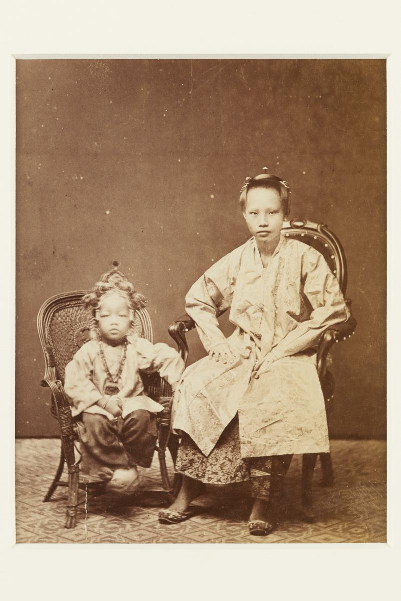 This studio portrait shows a nyonya seated with a small child standing on the right. On the verso is the studio mark of “Tjie Lan”.This large group of photographs provides important visual documentation of the fashion, studio photography and lifestyle of Peranakans of the Straits Settlements and Indonesia in the late 19th to mid-20th centuries. The collection also allows study of different photographic techniques and covers a wide range of themes, including changing fashions (from baju panjang and baju kurong to kebaya and cheongsam), festive celebrations (weddings, funerals, ancestral rites, Chinese New Year), interiors, transportation and children.