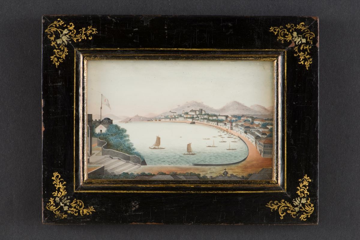 This is a fine painting of Macau’s harbour by an unknown Chinese artist working in the early 19th century. The view is said to be taken from Outer Harbour, known as the Praia Grande, to the east of the Macau peninsula. It was the site of the governor’s house, administrative offices, and commercial establishments. The artist has included the characteristic curving shoreline of the Praia Grande and several Portuguese built fortifications. On the right is the plateau of Forte Monte and below it on the point of the bay in the right foreground is the fort of São Francisco. Convents and churches are also depicted. There was a great demand for views of the places the Europeans and the Americans visited. From mid-18th to 19th century, many Chinese artists executed port scenes, landscapes, and portraits based on European and American prints. A large number of these paintings existed, but few are properly documented as to artist and date, which even fewer give any clue as to what may have been their stylistic influence or how the painter might have learned to paint in a Western manner.