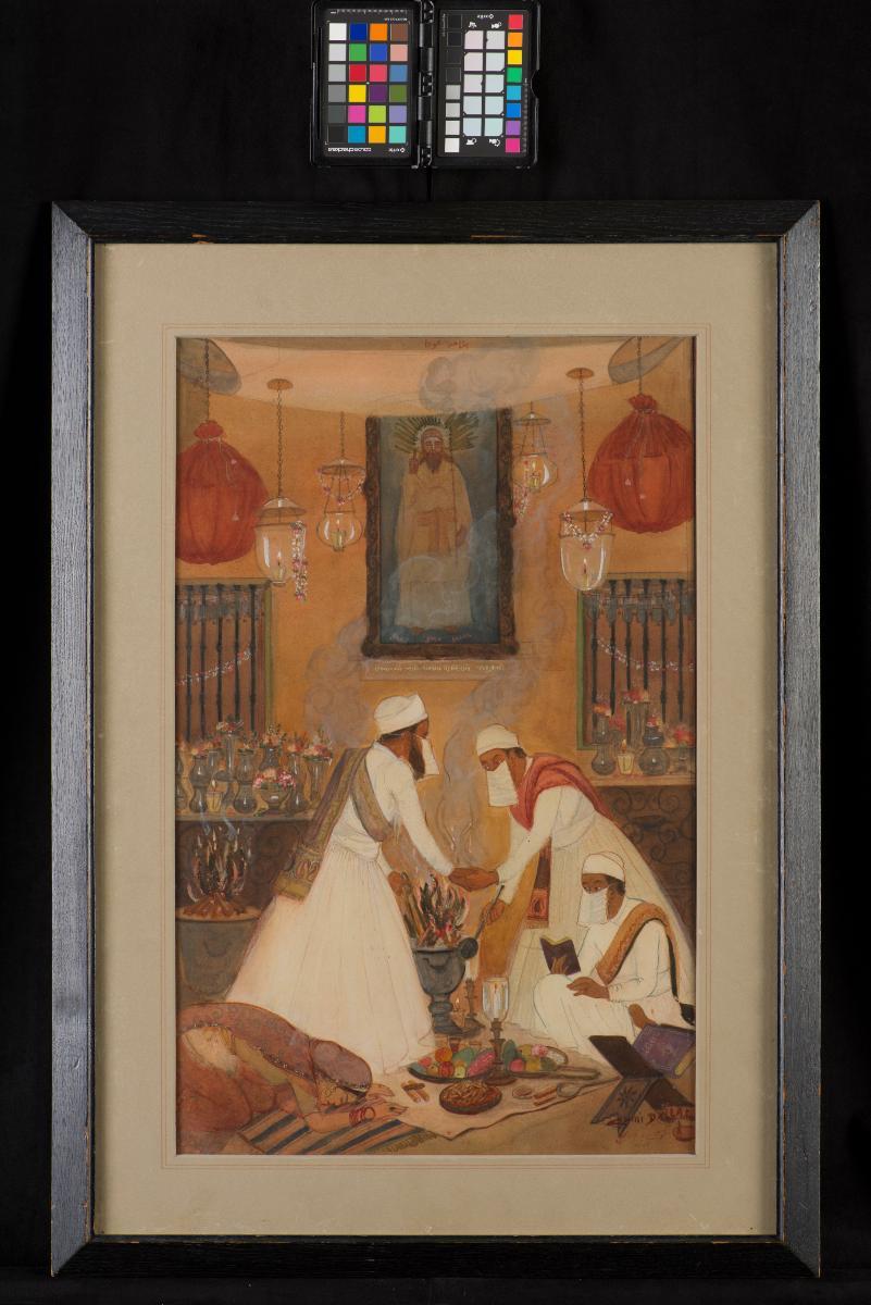 Parsi silver shops in Bombay and Gujarat supplied the Parsi community with ritual articles. In addition, silver items were imported from southern China as well. This box comprises four silver panels lined with an aromatic wood and a silver hinged cover; the silver is repoussed and chased with scenes relating to the Zoroastrian Parsis. Depicted here are the deity Ahura Mazda and priests attending the sacred fire as well as a king-like figure shown sheltered under an umbrella accompanied by attendants carrying flywhisks. The use of the umbrella to denote kingship and the presence of the flywhisk is an Indian practice rather than a Persian one. Inside, the box is split into two compartments by a silver partition. The base is plain, hammered silver.