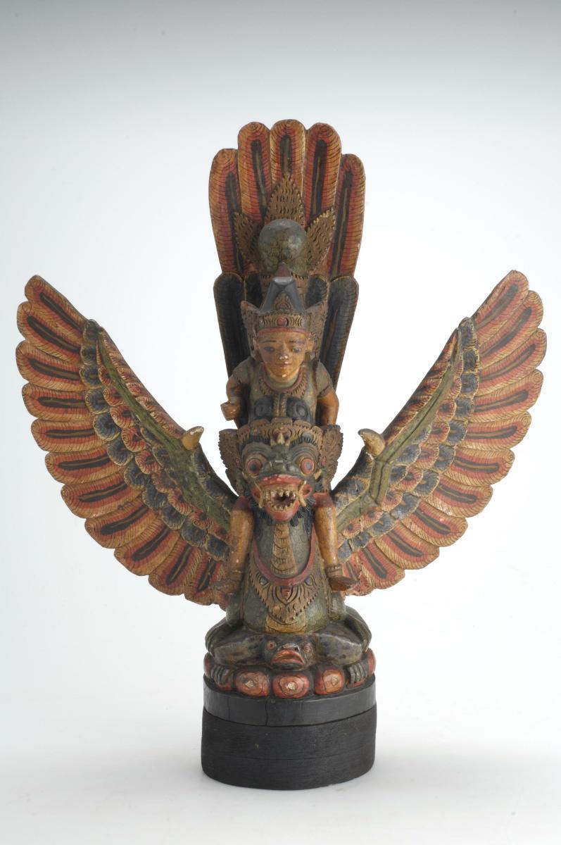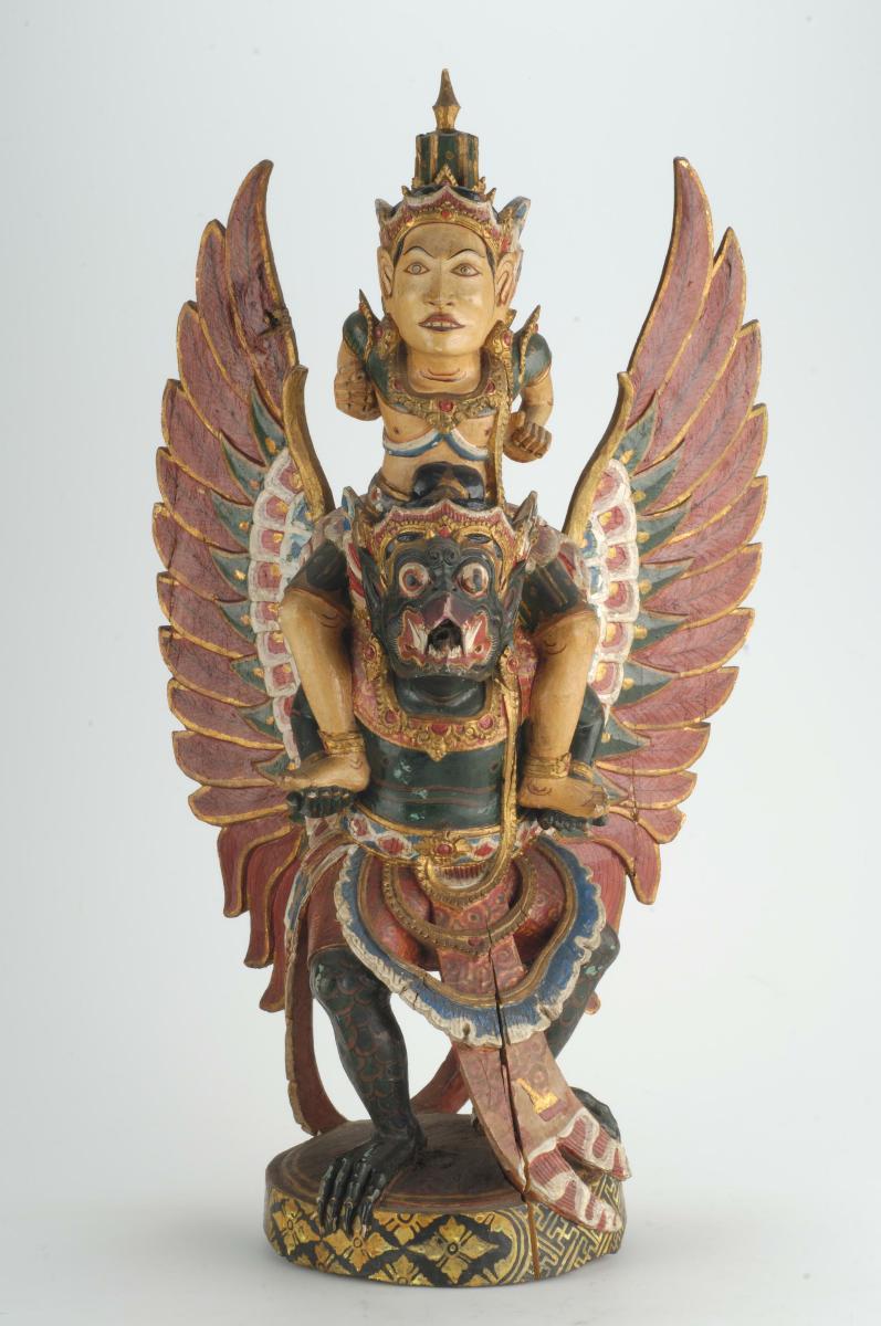 This is a superior bronze figure of Vishnu dating to the Chola period. Such images were produced using the cire perdue or lost-wax process, in the district of Thanjavur, the capital of the Chola kings who ruled over parts of south India between 10th – 13th centuries CE. These bronzes strictly adhered to the prescriptive Shilpa Shastra. However, since the cire perdue process required the mould to be broken, each sculpture was one of its kind and unique. While smaller bronzes were produced for use during temple festivals; they were decorated, venerated and carried through the streets of the town for devotees to witness, larger bronzes were affixed at the temple complex for worship.Vishnu is seen here standing on a lotus base and square plinth, his upper hands carrying the shanka and chakra attributes, his principle hands in abhaya (fear-allaying) and katyavalambita (hand resting on his hip) mudra. The figure wears cylindrical, tapering headgear; and in keeping with images of the Later Chola period he is highly ornamental in dress and jewellery. Poles could be inserted through the holes provided at the base to facilitate the carrying of the idol during temple festivals and processions.